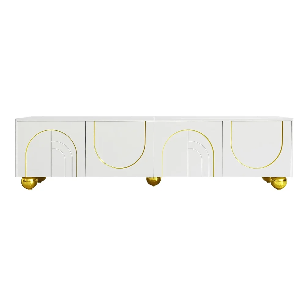 Белый шкаф для телевизора 170 см, низкая панель с текстурированными дверями и золотыми акцентами — современный с открытой полкой и круглыми золотыми ножками