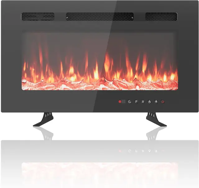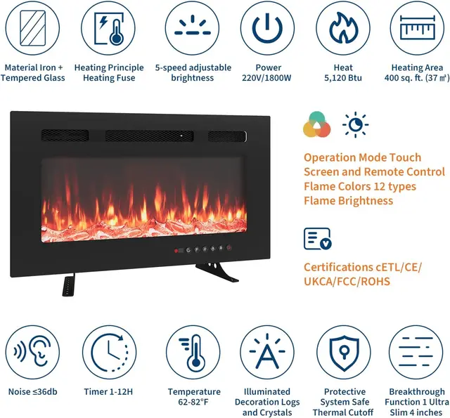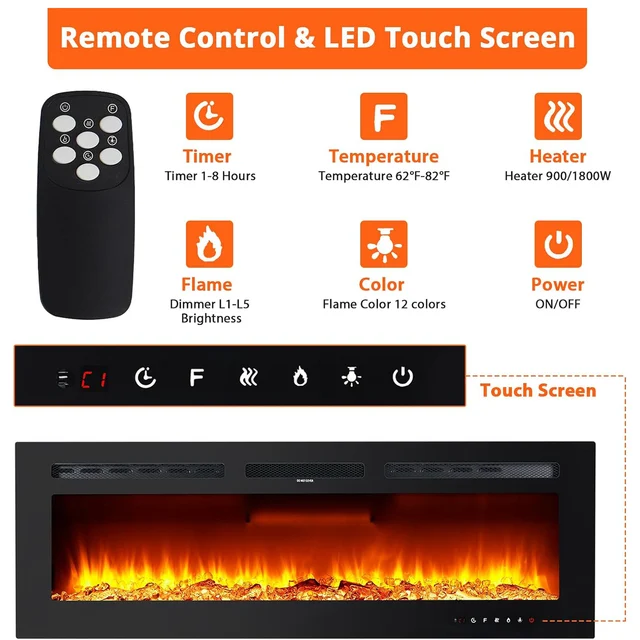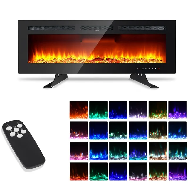Электрический камин 107 см, 127 см, настенный, встраиваемый и настенный, с регулируемым пламенным цветом, таймером, сенсорным экраном, бревнами и кристаллами