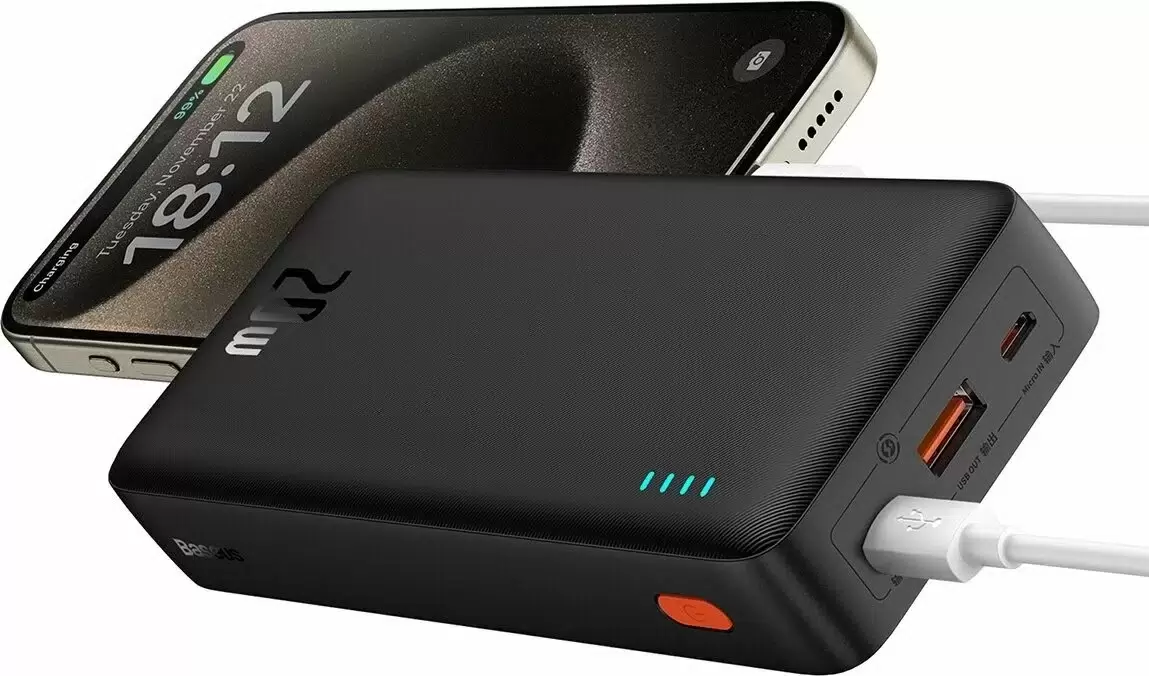 Корпус выполнен из прочного пластика с текстурированной поверхностью, благодаря которой устройство не скользит в руках и не собирает отпечатки. Несмотря на внушительную ёмкость, пауэрбанк остаётся относительно компактным и легко помещается в рюкзак или сумку. Дизайн выдержан в фирменном стиле Baseus — строгий, аккуратный, без лишних деталей, с удобной индикацией уровня заряда, которая позволяет точно понимать, сколько энергии осталось.