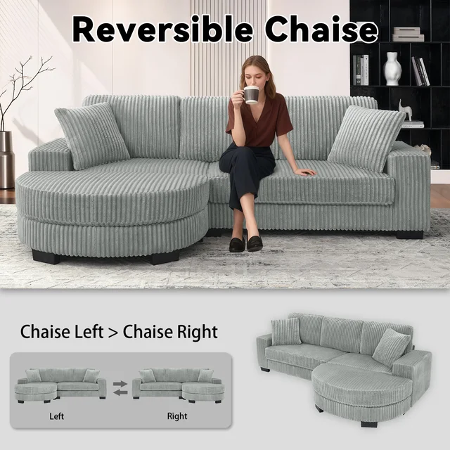 Г-образный угловой диван – 4-местный диван, 256,5 х 133,5 х 89 см, классический вельвет, модульный дизайн с овальным пуфиком, 2 подушки