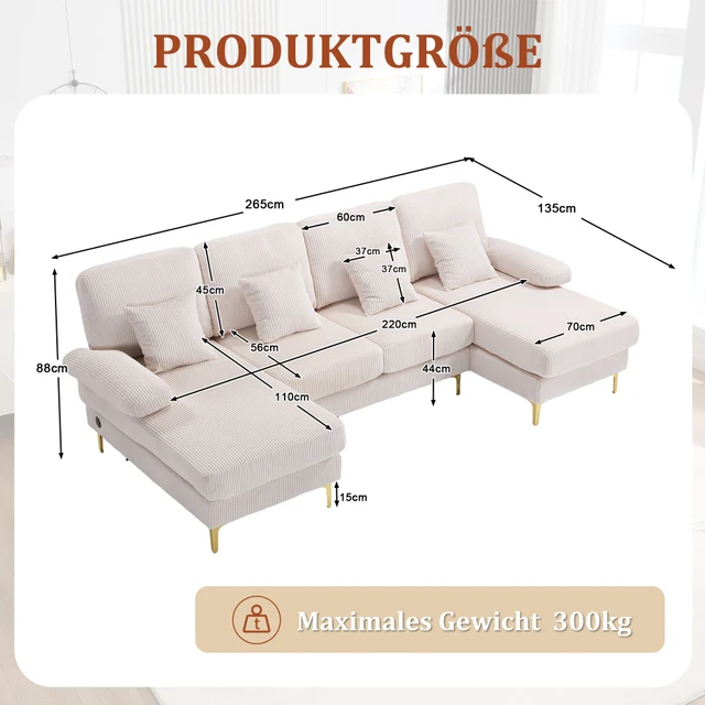 Современный U-диван со светодиодной подсветкой и каркасом из цельного дерева с портом USB-C, 4 роскошными подушками и эргономичной спинкой премиум-класса