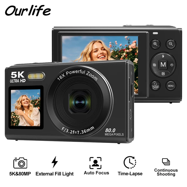 Цифровая камера Ourlife CCD с двумя экранами, портативная цифровая камера с 18-кратным зумом, 5K, винтажный видеорегистратор Vlog, 80 МП, CCD-камера для селфи