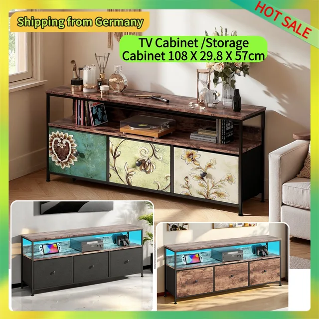 Шкаф для телевизора Comanlai 108 см со светодиодной подсветкой и 3 тканевыми ящиками, шкаф для хранения с металлическим каркасом и деревянной столешницей, тумбочка
