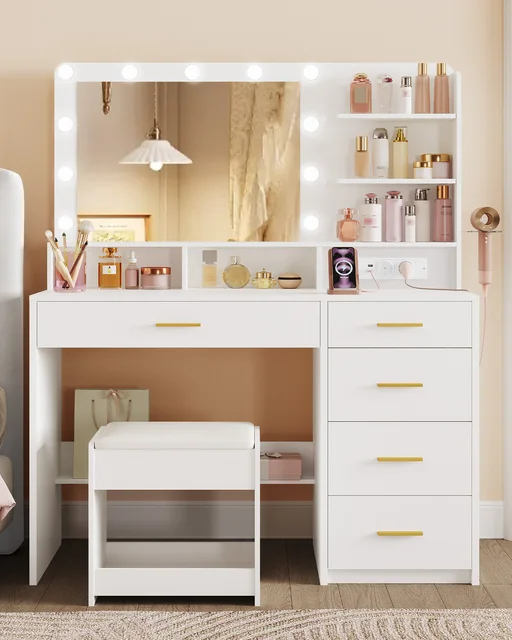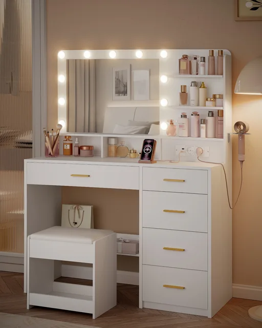 COMHTOM Белый туалетный столик, в комплект входят светодиодные зеркала с регулируемой яркостью, позолоченные аксессуары и несколько мест для хранения.