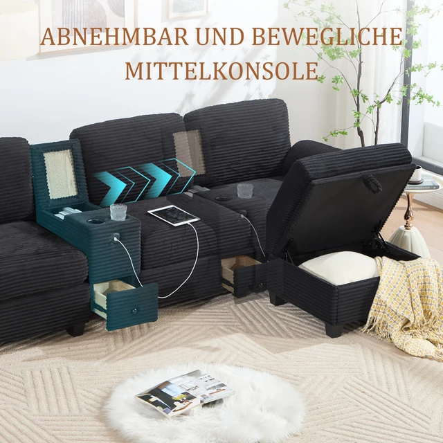 LVHOM Современный большой вельветовый диван — съемная центральная консоль, USB-порт и боковой карман для хранения, комфорт и функциональность