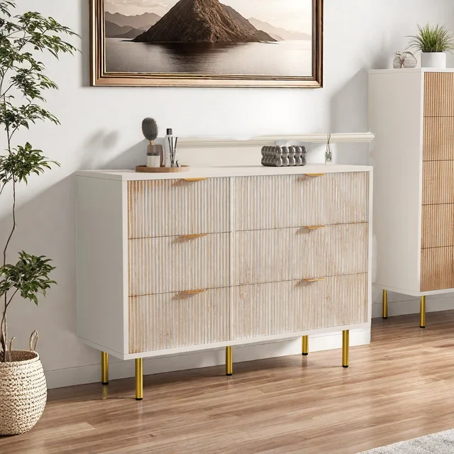 Комод с 6 ящиками, комод, шкаф для хранения вещей, сервант, современный, шкаф, для спальни, прихожей, гостиной, 100х34х73 см, белый + цвет натурального дерева