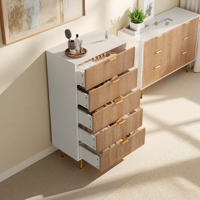 Комод с 5 ящиками, комод, шкаф для хранения вещей, сервант, современный, шкаф, для спальни, прихожей, гостиной, 60 х 34 х 109,8 см, белый + цвет дерева