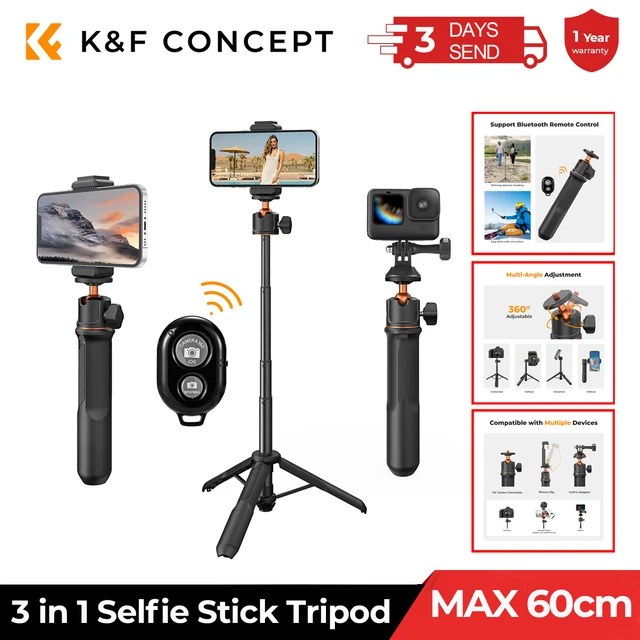 K&F Concept 60 см 3 в 1 палка для селфи настольная подставка с шаровой головкой держатель для мобильного телефона штатив для камеры GoPro Bluetooth пульт дистанционного управления