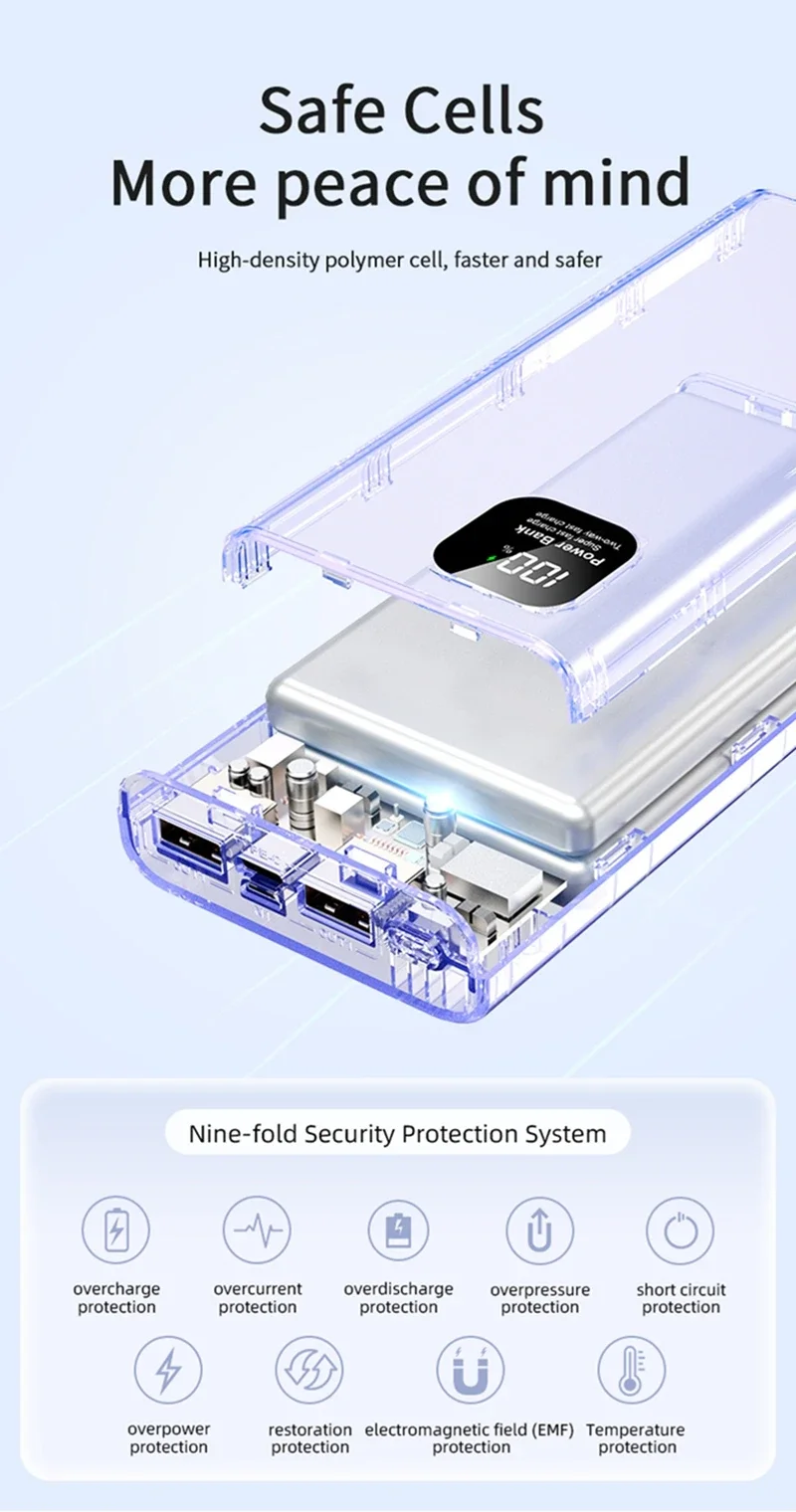 Безопасность имеет первостепенное значение при зарядке устройств, поэтому этот внешний аккумулятор оснащен передовыми функциями безопасности, которые защищают как ваши устройства, так и сам внешний аккумулятор.Встроенные средства защиты, такие как защита от перезарядки, защита от короткого замыкания и механизмы контроля температуры, гарантируют безопасную и эффективную зарядку ваших устройств без риска повреждения от скачков напряжения или перегрева.