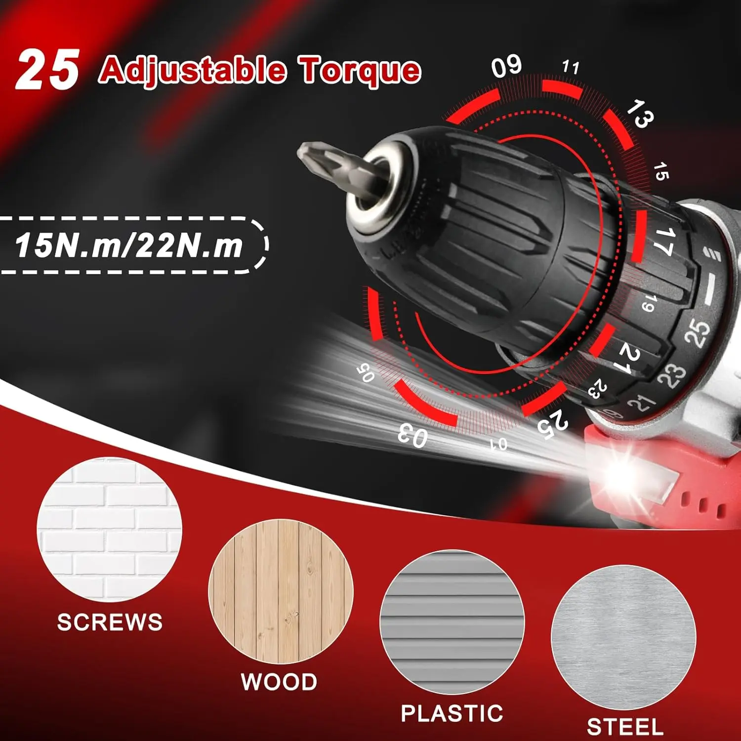 • 【25+1 уровней крутящего момента + 2-скоростная коробка передач】Сверло/шуруповерт имеет 25 регулируемых уровней крутящего момента плюс режим сверления — идеально подходит для всех применений: от завинчивания до сверления.2-скоростная коробка передач (400 об/мин/1500 об/мин) обеспечивает мощный крутящий момент до 22 Нм.Встроенный светодиодный светильник обеспечивает лучшее освещение рабочей зоны и большую точность во время работы.