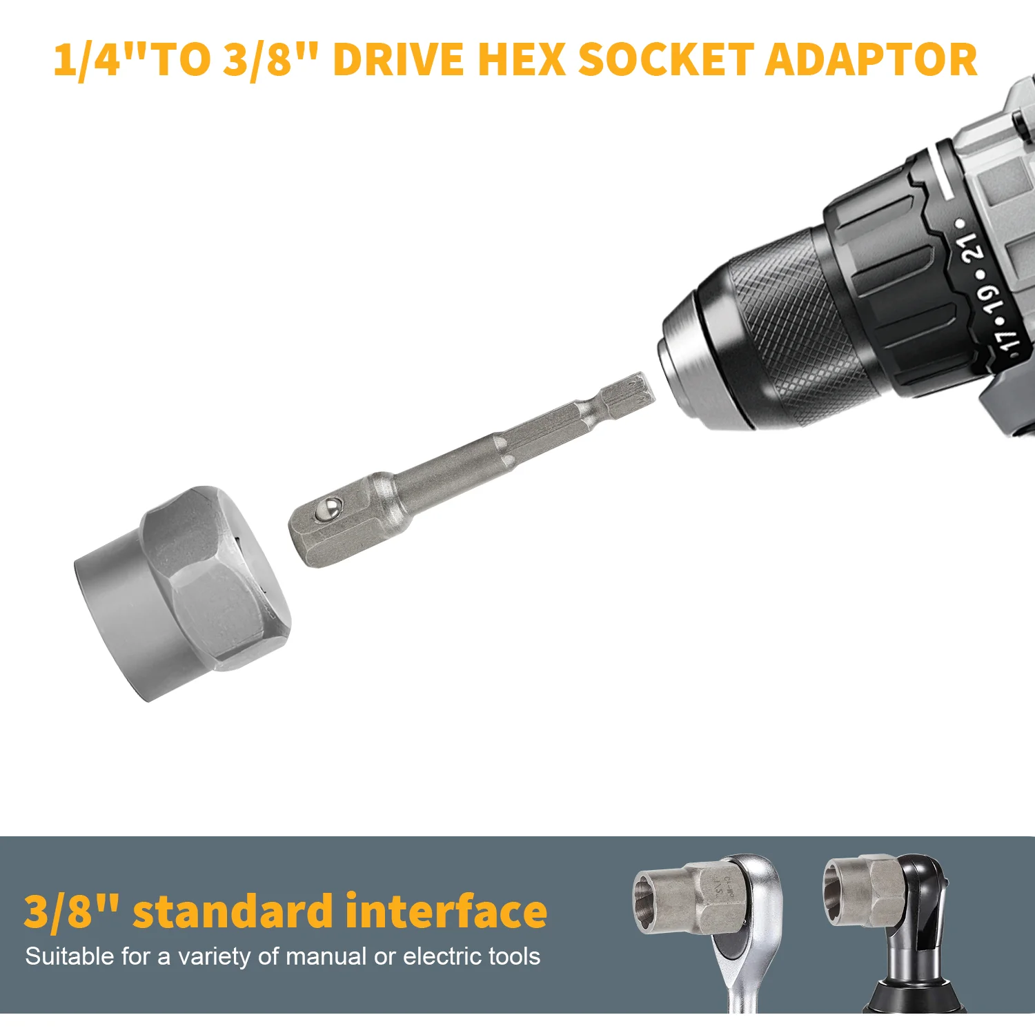 Стандартный адаптер с шестигранной головкой от 1/4 до 3/8 дюйма, позволяющий экстракторам совместимы с обычными или сверхмощными электроинструментами, приводами и инструментами с ручкой отверток.