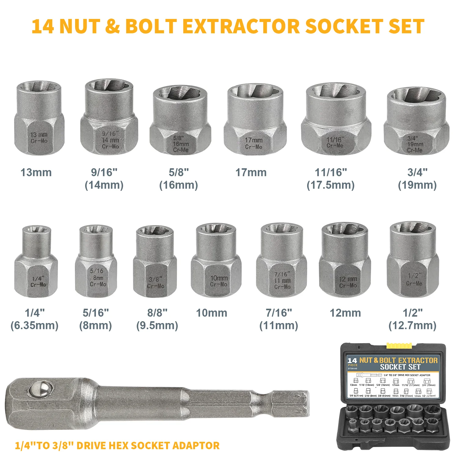 14 шт., набор головок для извлечения гаек и болтов, инструмент для ремонта автомобиля, набор ударных головок 6,35-19 мм, стальные ручные инструменты Cr-Mo