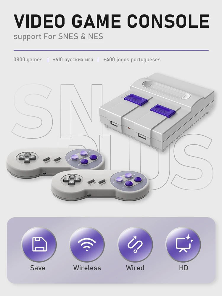 Эта игровая консоль в стиле ретро для SNES имеет мини-дизайн.Когда вы включаете телевизор, выберите HDMI-совместимый режим выхода (не режим AV).Подключи и играй!На этой игровой консоли предварительно установлен 926 игр и более 100 16-битных россий ИЛИ 200+ 16-битных игр по Португалии (игра на язык России или Португалии зависит от вариантов покупки), с приключениями, борами, головоломками, ресурсами, стрельбой, спортом и т. д. .Выбирайте игру, в которую вам нравится играть!