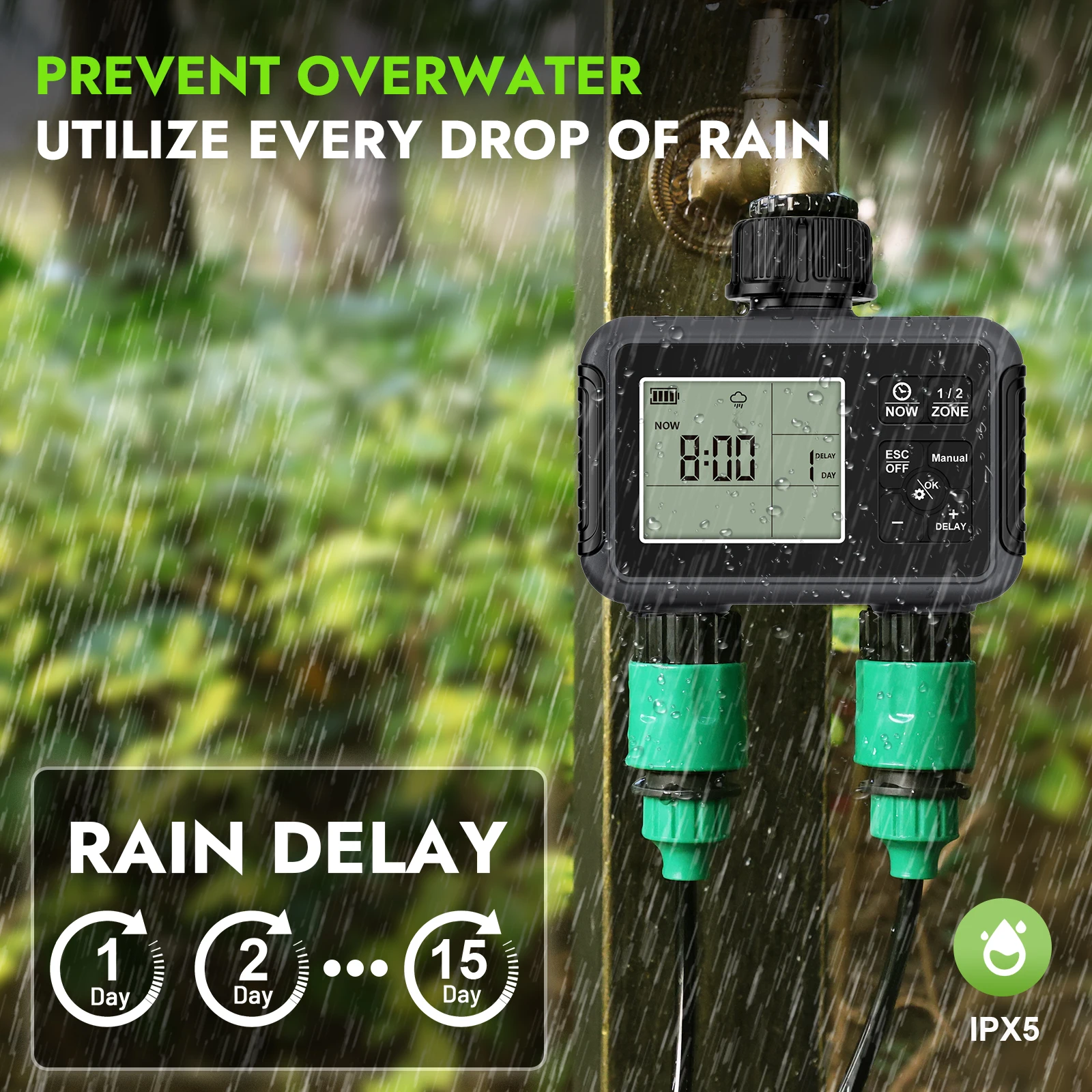 【Режим задержки дождя】 Режим задержки дождя нашего таймера шланга экономит воду.Нажмите и удерживайте кнопку «+» в течение 3-5 секунд, чтобы приостановить расписание на 1–7 дней, не нарушая установленную программу.Нет датчика дождя?Нет проблем.Просто выставьте его на местном прогнозе погоды.Это предотвращает чрезмерный полив в дождливые дни, экономя значительное количество воды.Благодаря автоматическому, ручному режимам задержки дождя все ваши потребности в поливе удовлетворены.Это интеллектуальный способ управлять поливом, независимо от того, находитесь ли вы в дождливую или сухую климату, и помогает вам быть более экологически сознательным, сохраняя при этом красивый двор или лужайку.