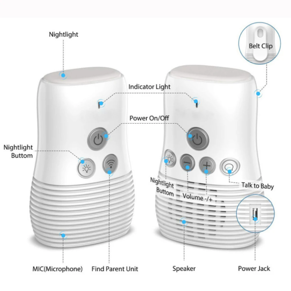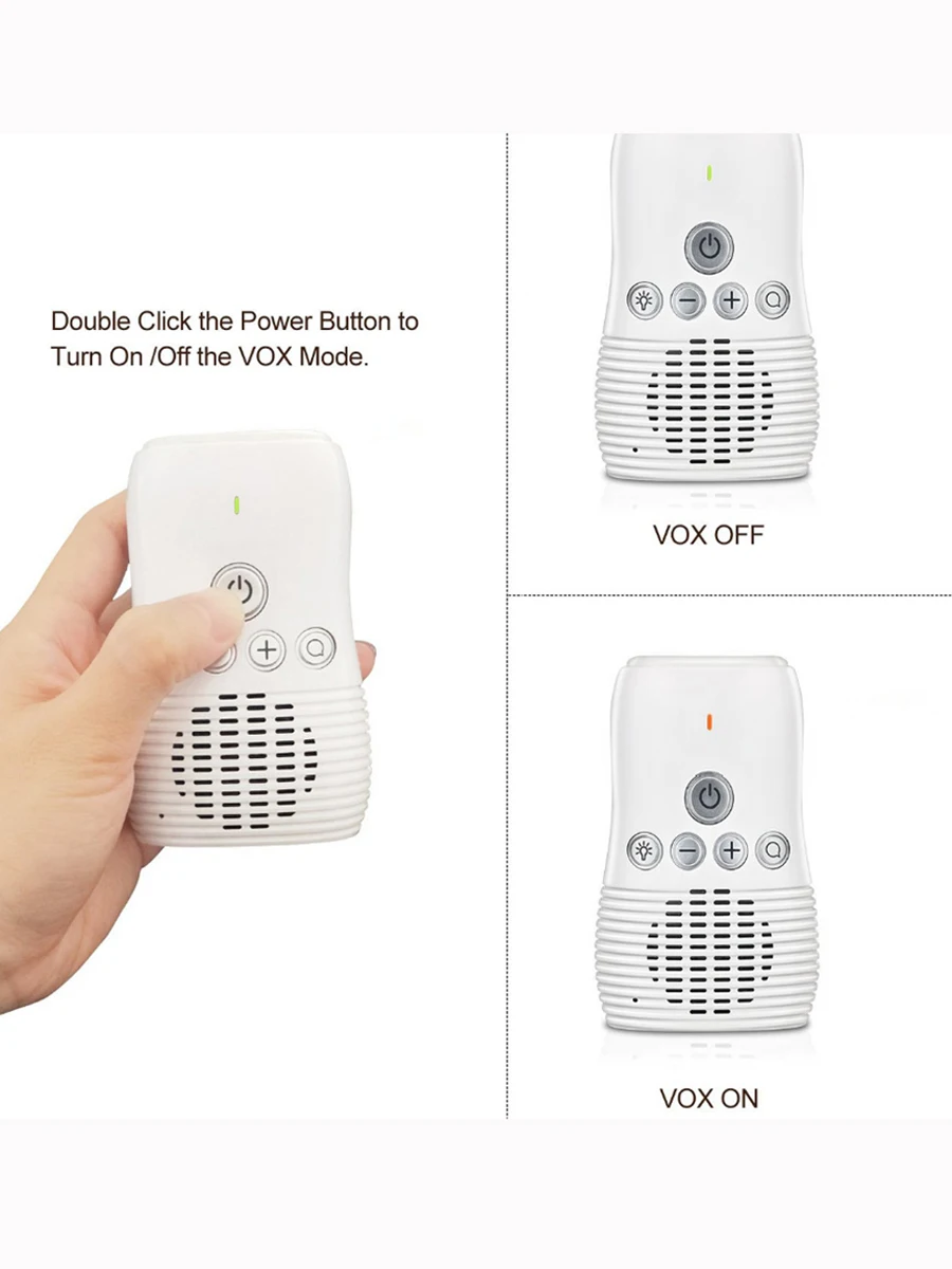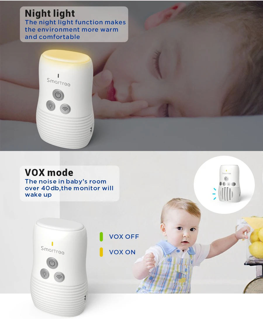 1.Обнаружение шума: когда шум в детской комнате ниже 40 дБ более 20 секунд, голос будет включен, и монитор отменяет небольшой фоновый шум, пока шум не превысит 40 дБ, монитор проснется и сообщит вам точно, когда ваш ребенок издает какой-либо звук.