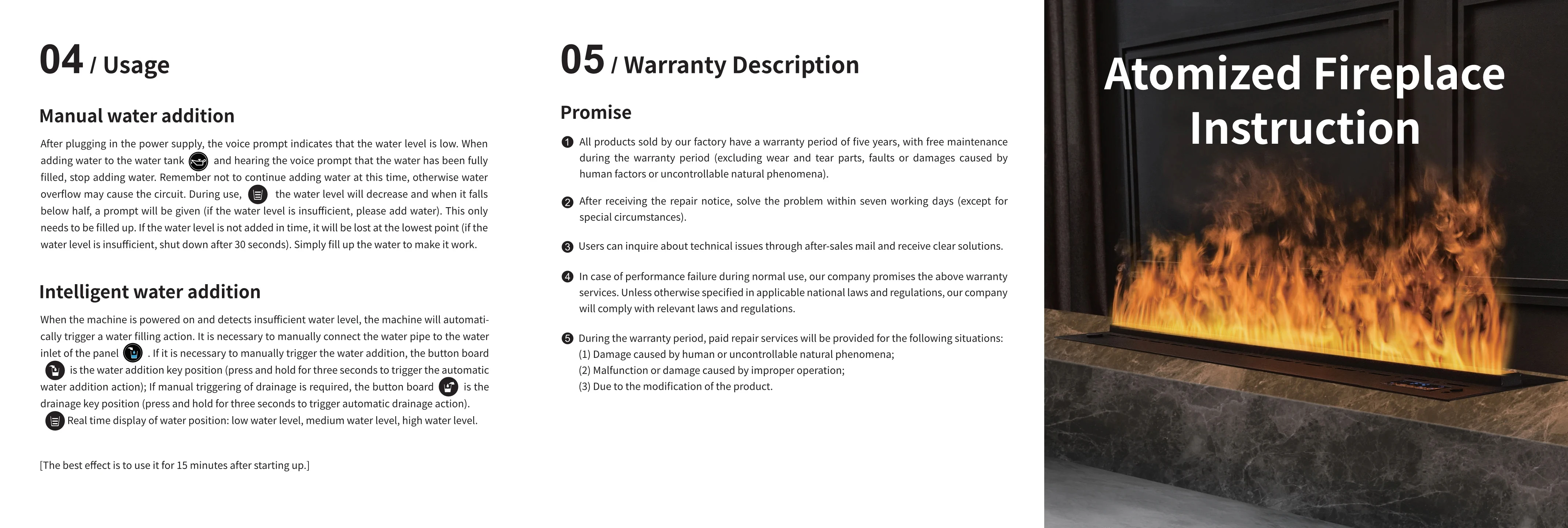 4.Чтобы продлить срок службы горелки, рекомендуется использовать очищенную воду, в случае попадания грязи воды в камин не сможет работать после длительного использования.