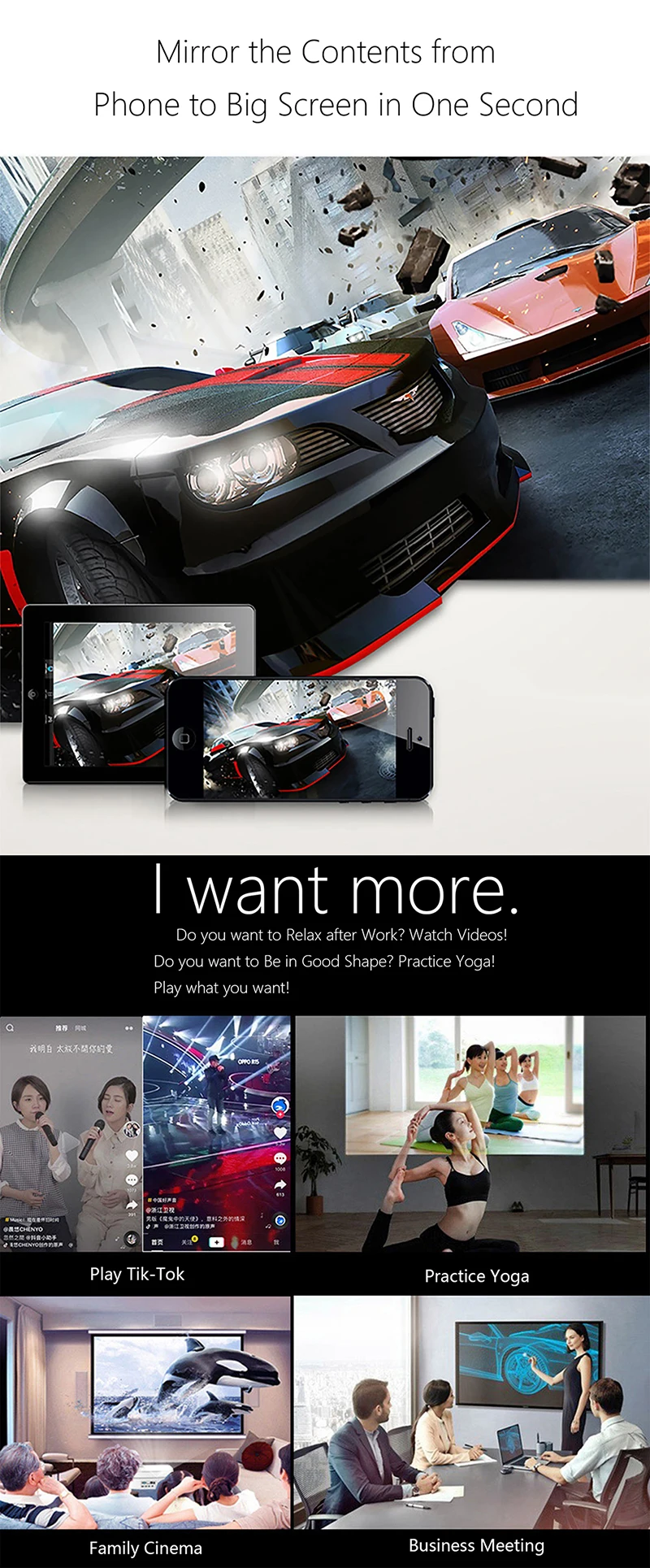 • 4. Широкое использование: смотрите с коллегами в зеркальном экране для встреч с проектором, делитесь PPT, почтой, документами и другим контентом по беспроводной сети.Смотрите с студентами на зеркальном экране в классе на большом экране, делитесь контентом обучения по беспроводной сети.Смотрите с семьей на домашнем зеркальном экране телевизора, делитесь фотографиями, видео и фильмами по беспроводной сети.Носите его во время путешествия, делитесь телефоном с телевизором в любое время.
