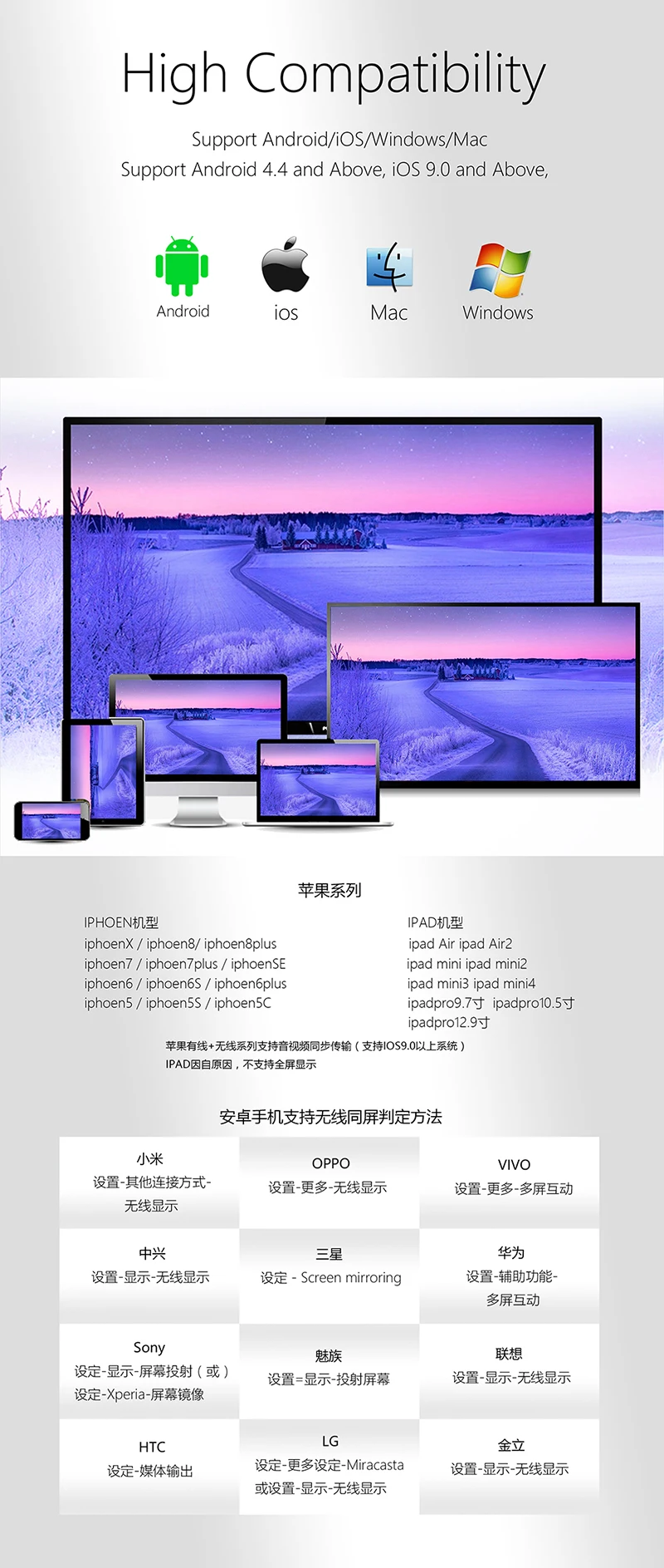 • 3. Широкая совместимость: поддержка Airplay, Miracast, протокола DLNA, а именно поддержка устройств и серий iOS 6.0+, Android 4.0+.