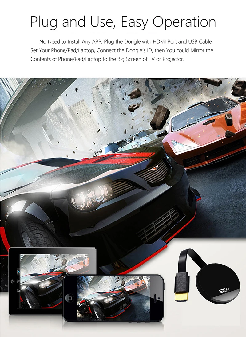 • 2. Простота в использовании: приложение и драйверы не требуются.Всего 3 шага, чтобы наслаждаться носителем на большом экране: Plug — больше, чем Connect — больше, чем зеркалирование, используя режим Miracast, DLNA и Airplay.Распознайте свой IP-адрес и автоматически сопоставьте свой местный язык.