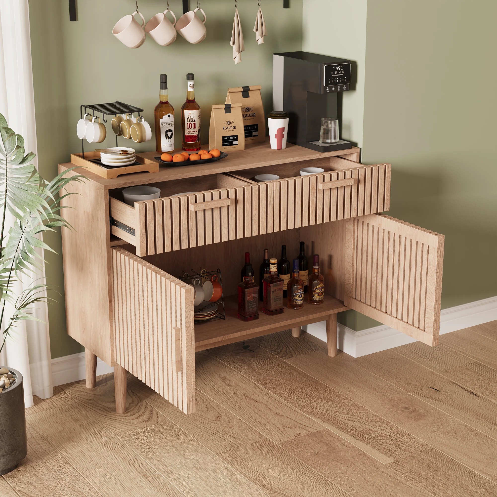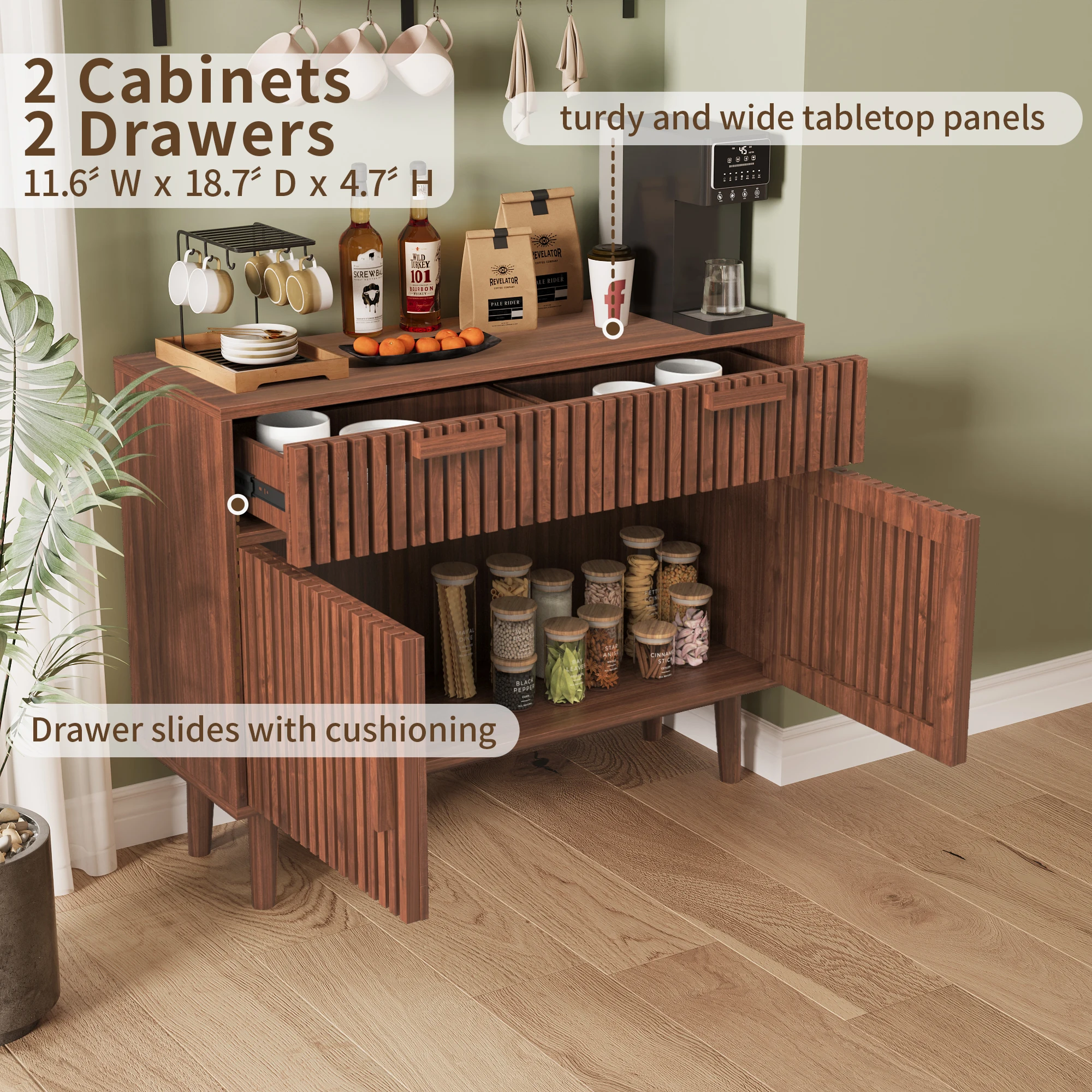 Многофункциональный ящик для хранения: шкаф с двумя ящиками, двумя дверцами и полками предлагает достаточно места для вашей посуды и кухонной утвари.Все аккуратно и в пределах легкой досягаемости.