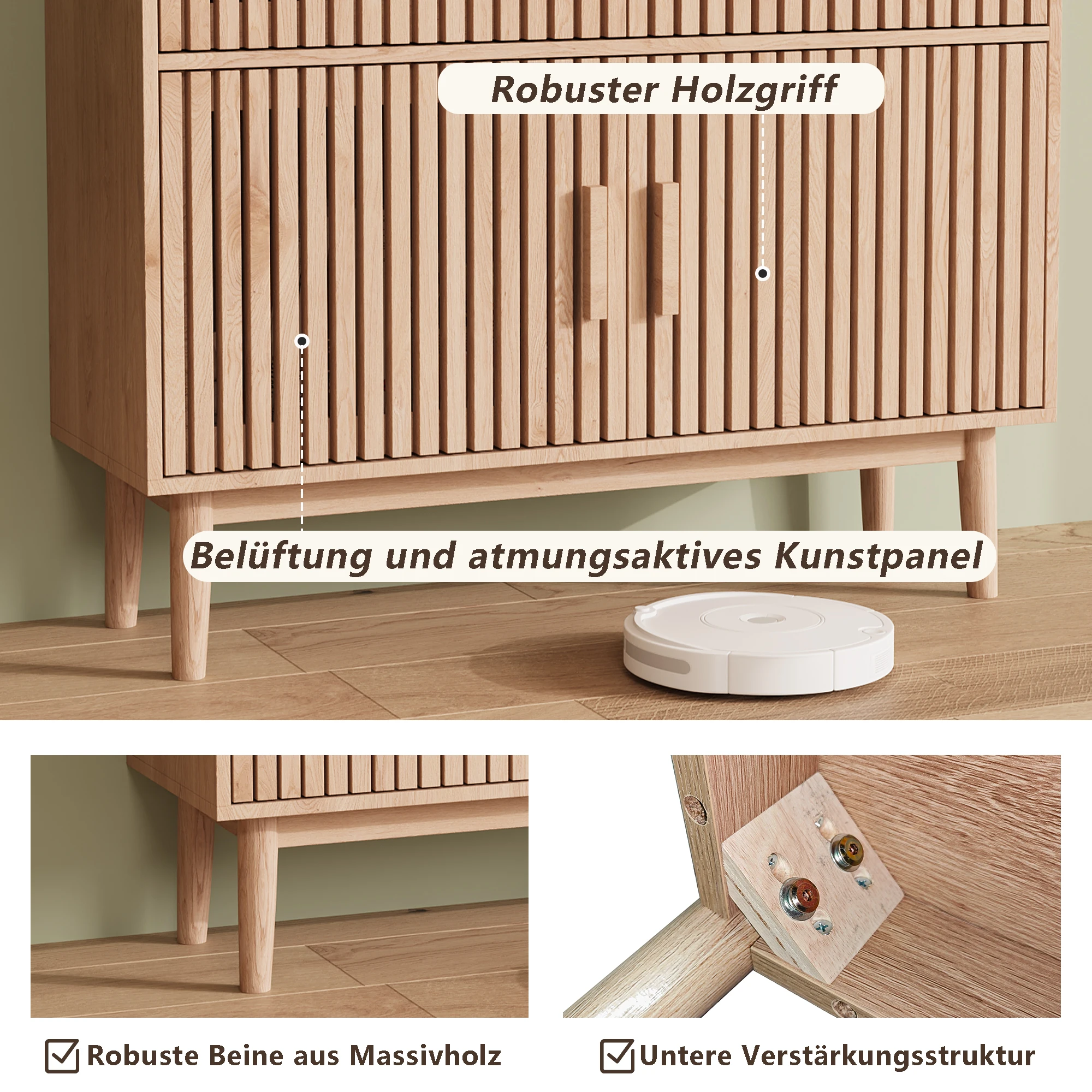 Прочная конструкция: Корпус из ДСП и МДФ в сочетании с ножками из массива дерева гарантирует устойчивость и длительный срок службы.