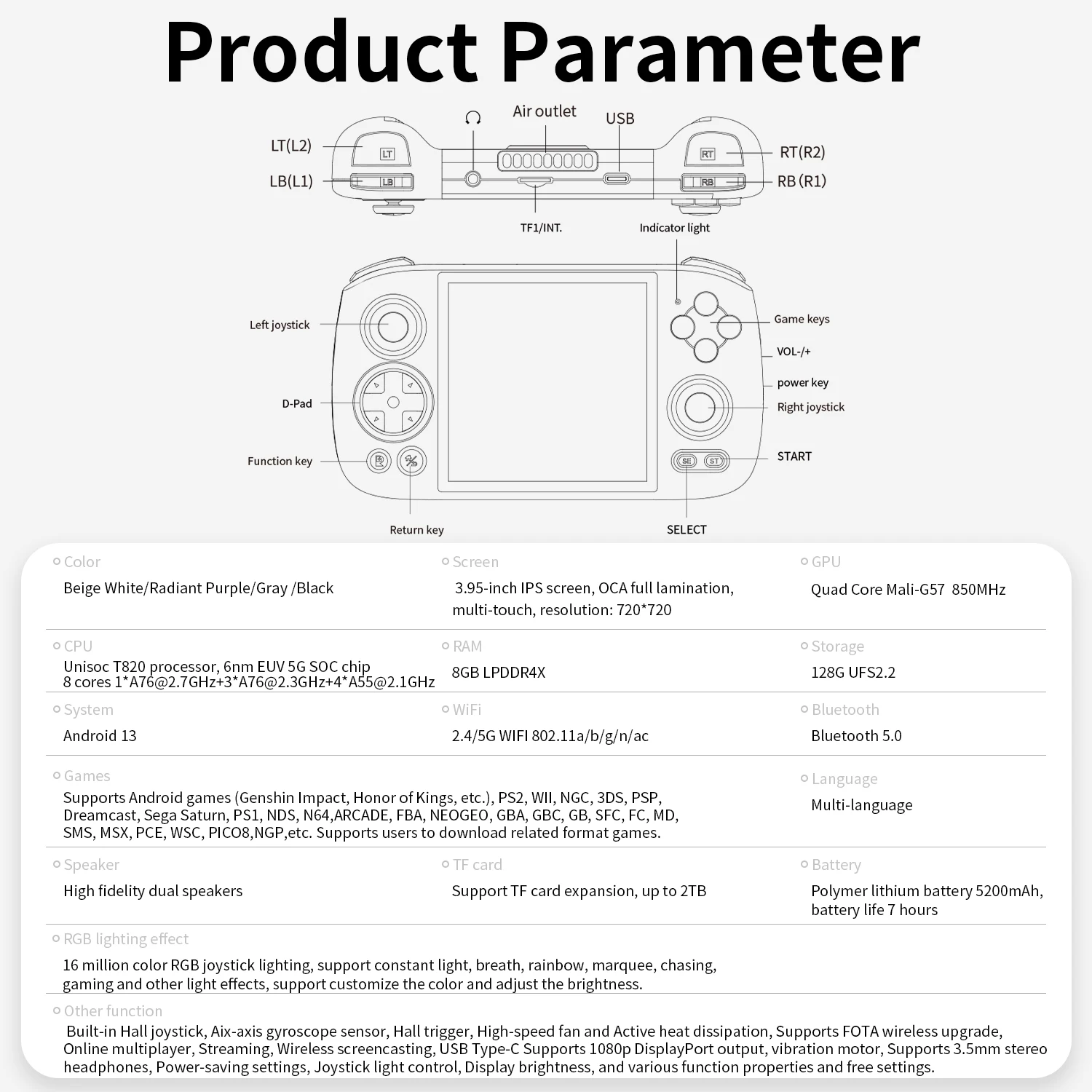Встроенный микрофон,Встроенный джойстик Холла, шестиосевой датчик гироскопа, триггер Холла, высокоскоростной вентилятор и активное рассеивание тепла, поддержка беспроводного обновления FOTA, онлайн-мультиплеер, потоковая передача, беспроводная скриньочная обработка, USB Type-C поддерживает выход DisplayPort 1080p, вибрационный двигатель, поддерживает 3.Стереонаушники диаметром 5 мм, настройки энергосбережения, управление освещением джойстика, яркость дисплея, различные функциональные свойства и свободные настройки. |