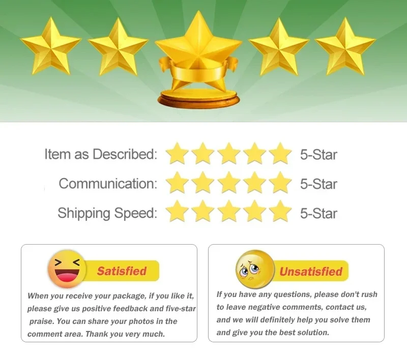 Когда вы получите посылку, если она вам нравится, пожалуйста, дайте нам положительный отзыв и оценку в пять звезд.Вы можете поделиться своими фотографиями в области комментариев.Большое спасибо.