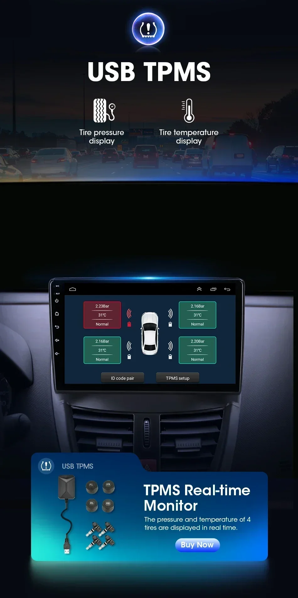 Поддержка USB TPMS, обратная связь о состоянии ваших шин в режиме реального времени, все больше и больше национальных стандартов производства автомобилей требуют, чтобы транспортные средства были оснащены устройствами сигнализации давления в шинах.Важность устройств предупреждения о давлении в шинах очевидна.