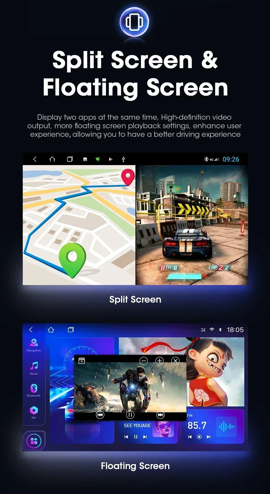 Разделенный экран и плавающий экран отображают два приложения одновременно, видеовыход высокой четкости, больше настроек воспроизведения плавающего экрана, что позволяет вам получить больше удовольствия от вождения.
