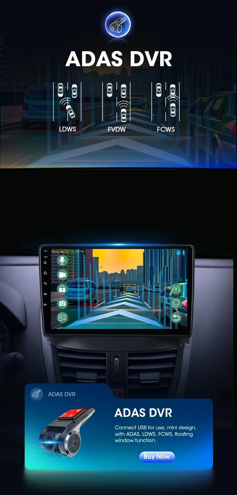 ADAS DVR поддерживается.ADAS DVR имеет встроенные несколько вспомогательных технологий вождения: вставьте карту памяти TF для записи видео и записи каждый момент в пути.
