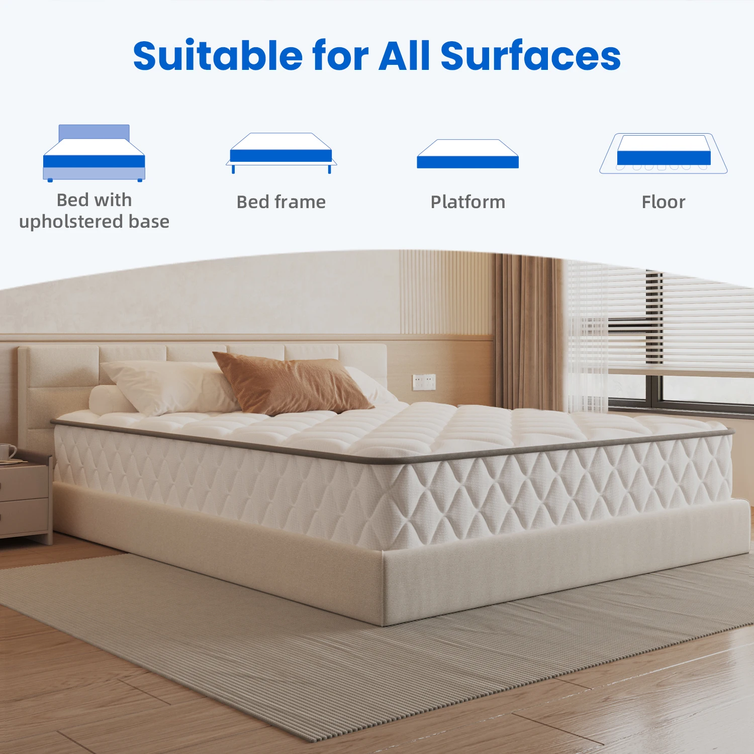 Этот матрас, совместимый с мягкими основами, каркасом кроватей, кроватями-платформами или используемый непосредственно на полу — этот матрас адаптируется к любой обстановке, сохраняя при этом полную поддержку и комфорт.Независимо от того, предпочитаете ли вы простое расположение или полноценный каркас кровати, этот пружинный матрас легко подойдет.