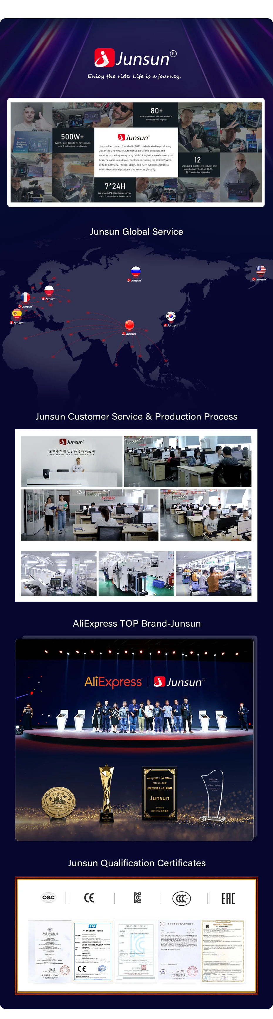 1.Как официальный магазин Junsun наплатформа, Мы стремимся поставлять подлинную оригинальную продукцию.Отправлено как один изплатформа10 лучших брендов Junsun заслужила доверие более 2 миллионов поклонников и уже более десяти лет обслуживает более 5 миллионов пользователей по всему миру.Выбирайте Junsun для зависимого, передового автомобильного оборудования, которое улучшит ваши впечатления от вождения, обеспечивая безопасность и интеллект.