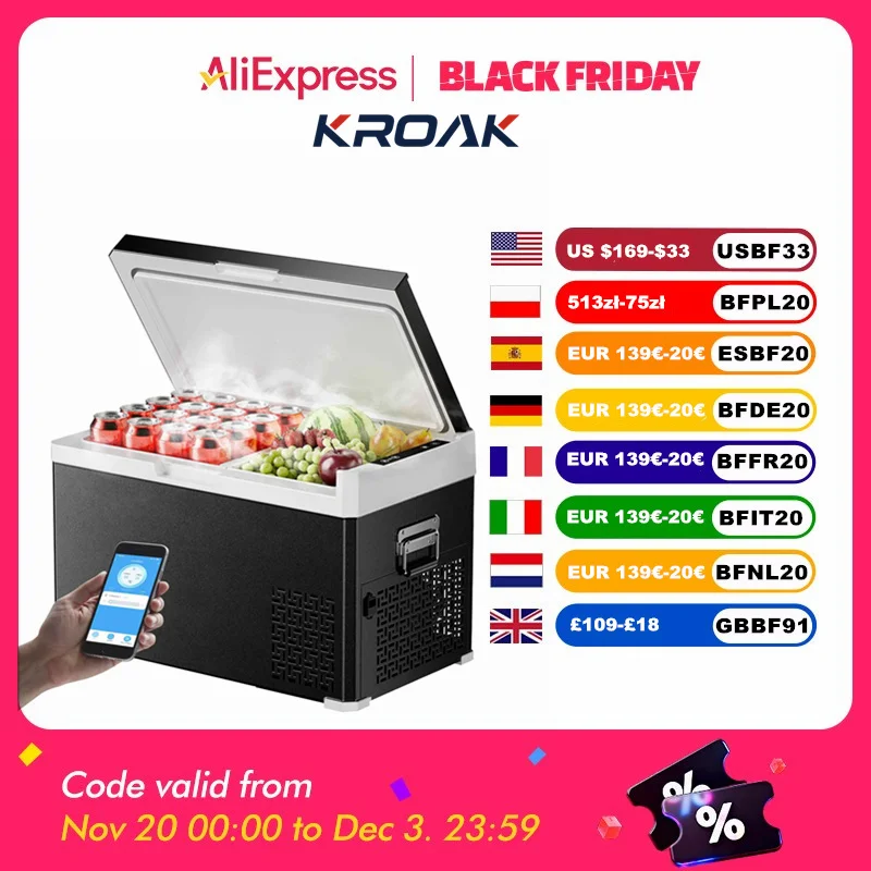 Автомобильный холодильник KROAK, 30 л, 40 л, портативная морозильная камера 12 В, 24 В постоянного тока с управлением через приложение, 110-220 В, двухзонный компрессор Cool Box для кемпинга