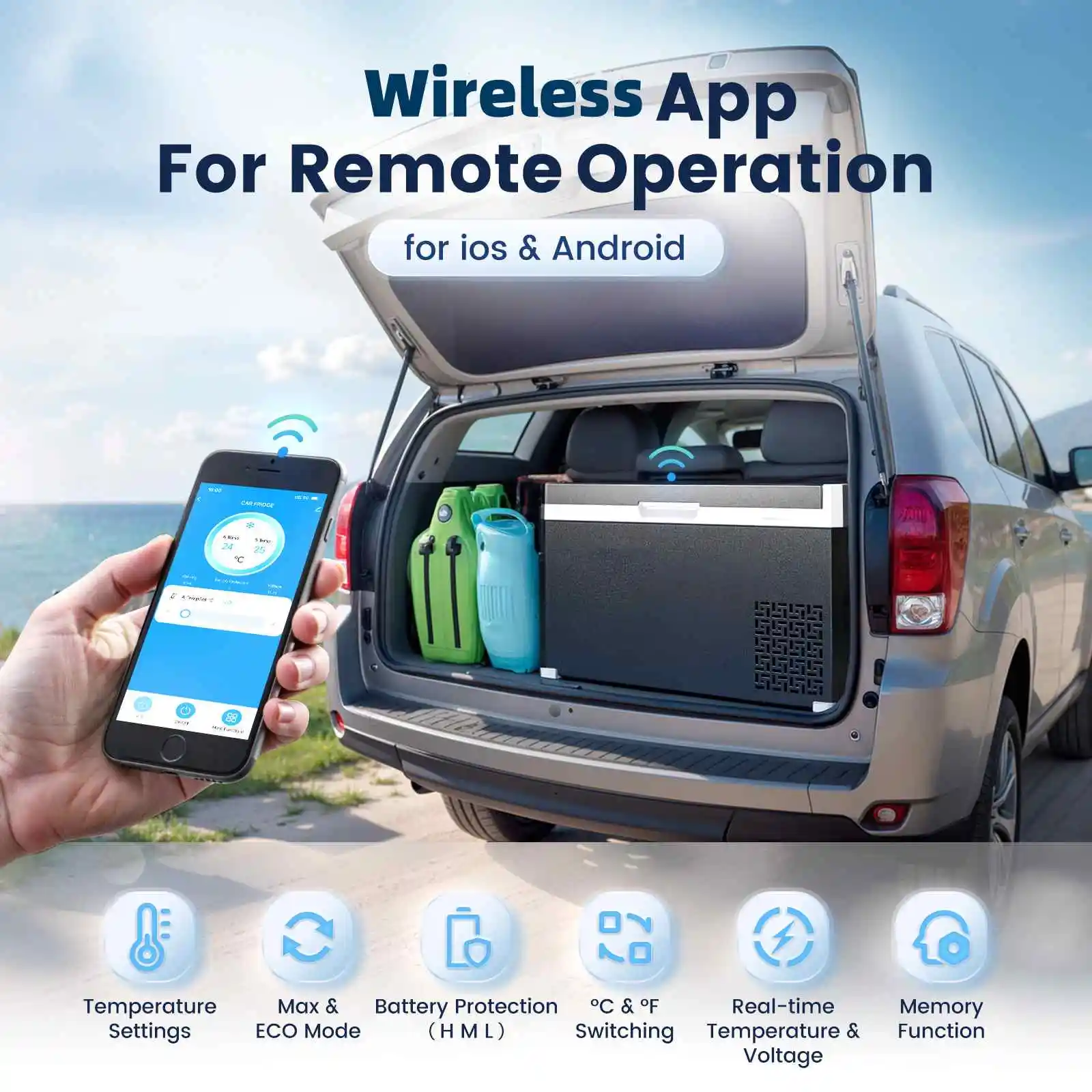 Автомобильный холодильник прочный и долговечный, подходит для всех видов суровых условий, таких как неровные дороги и кемпинг в дождливый день, со встроенными светодиодными фонарями для удобства использования в ночное время и практичным дизайном верхних подстаканников.Между тем, он прошел испытание на падение, чтобы гарантировать надежность при длительном использовании.