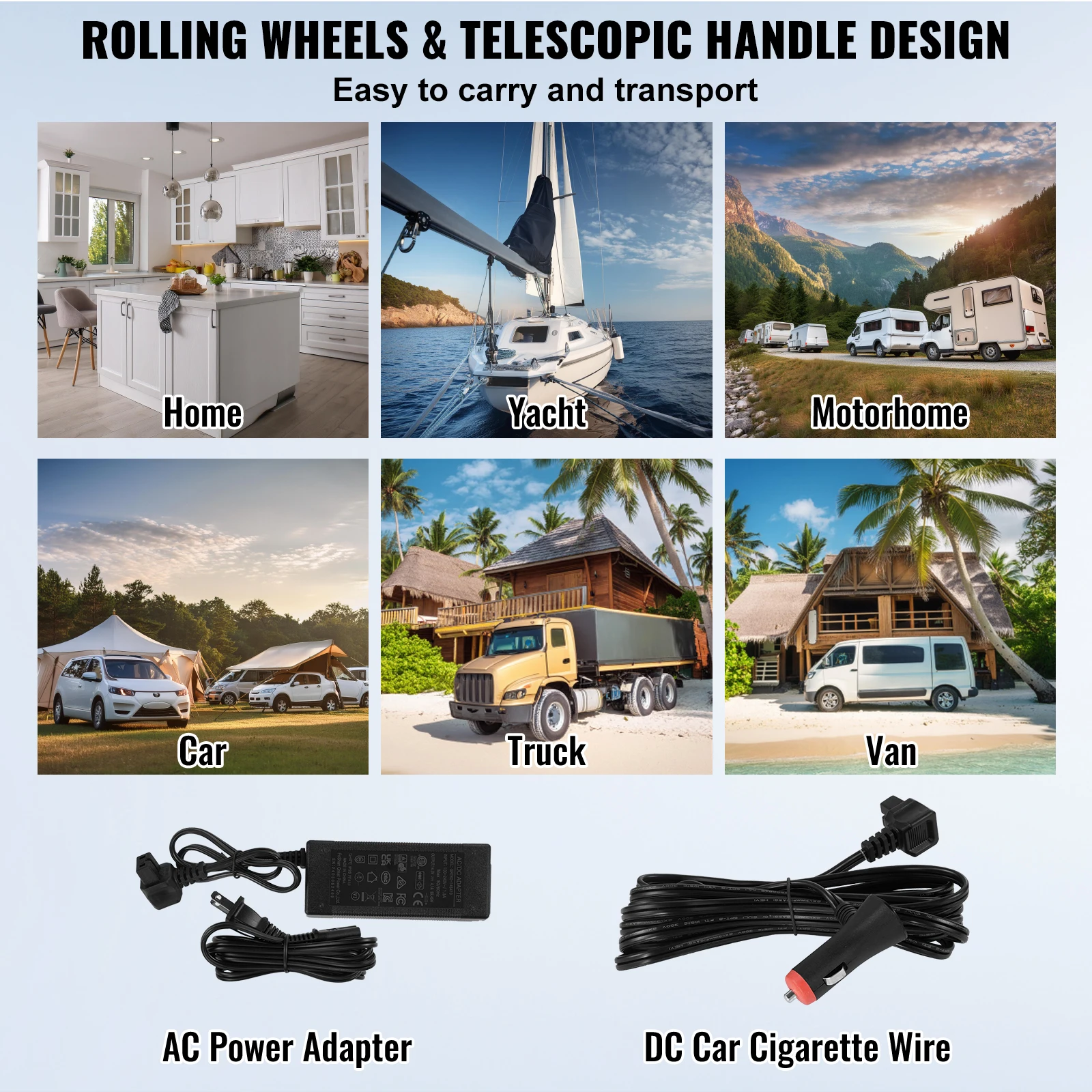 Двойное использование для дома/автомобиля: прочные колеса и телескопическая ручка для легкой и стабильной транспортировки. Кроме того, автомобильный холодильник оснащен адаптерами переменного тока 110/240 В и 12/24 В постоянного тока, что делает его пригодным для использования дома, на яхтах, автофургонах, легковых автомобилях, грузовиках и фургонах.