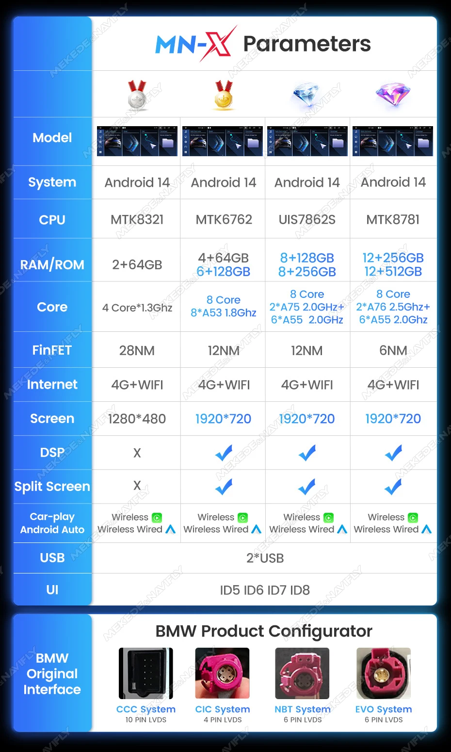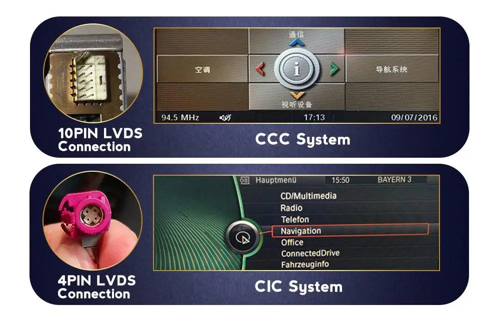 Оригинальный 4-контактный разъем LVDS, пожалуйста, выберите CIC для размещения заказа.Примечание. Если в вашем автомобиле есть система CCC, вы не можете использовать ручки idrve для управления меню Android, ими можно управлять только сенсорным, но вы можете управлять оригинальной системой CCC через Idrive.Подходящие модели автомобилей для установки