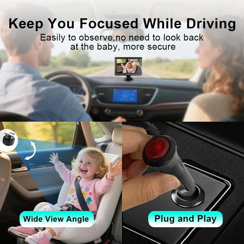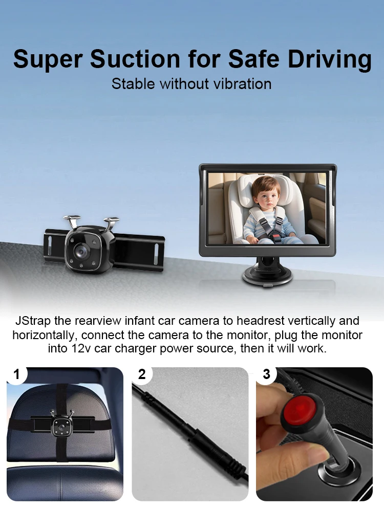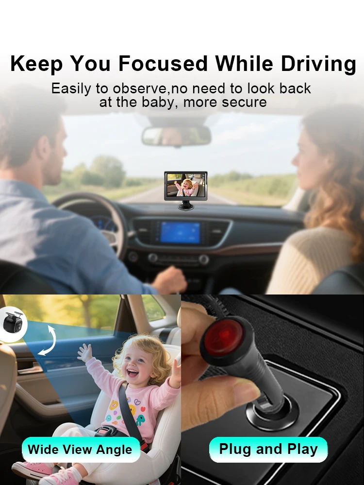 — Подключи и работай, простая установка: сборка не требуется. Просто прикрепите камеру к подголовнику, подключите камеру к монитору и подключите монитор к источнику питания автомобильного зарядного устройства 12 В. Монитор автоматически включит и отобразит заднее сиденье ребенка. Для лучшего использования избегайте чрезмерного напряжения кабелей, закрепите соединение и держите устройство подальше от прямых солнечных лучей.