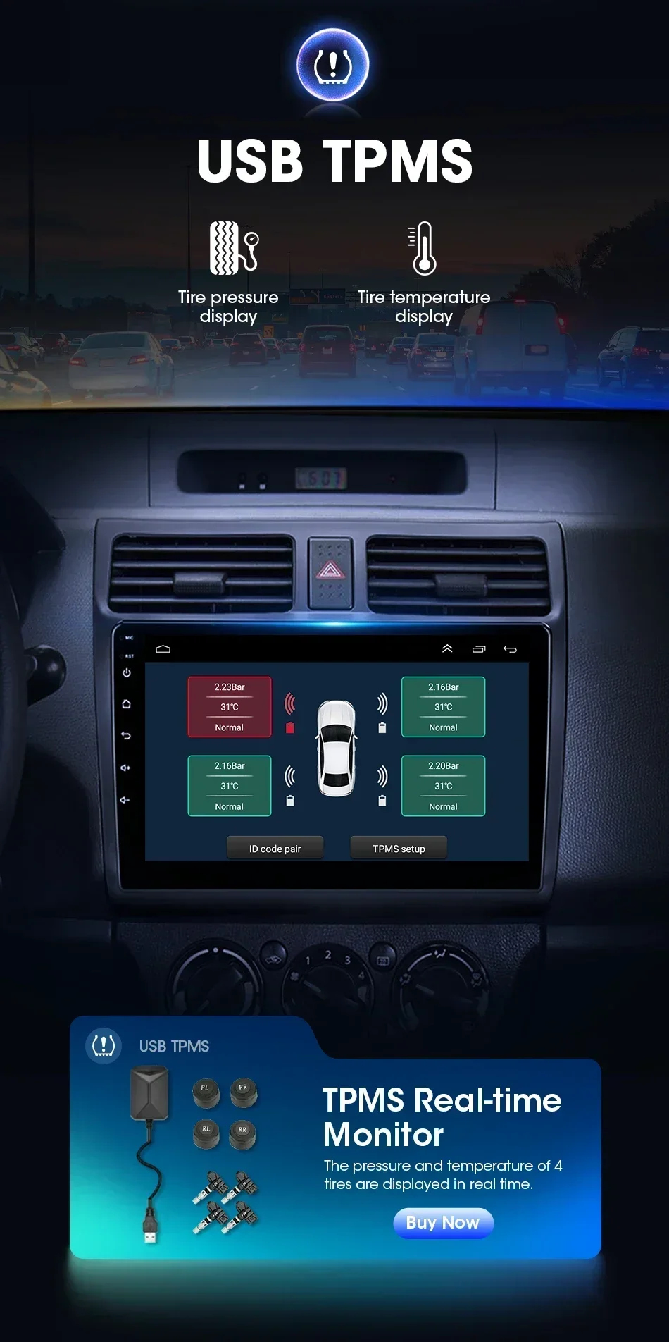 Поддержка USB TPMS, обратная связь о состоянии ваших шин в режиме реального времени, все больше и больше национальных стандартов производства автомобилей требуют, чтобы транспортные средства были оснащены устройствами сигнализации давления в шинах.Важность устройств предупреждения о давлении в шинах очевидна.