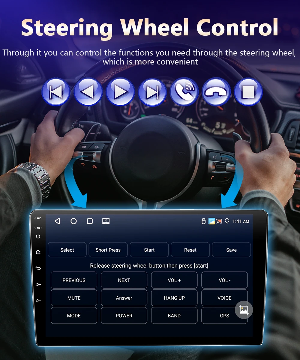 ●Управление на рулевом колесе: поддержка оригинальной функции обучения кнопкам на рулевом колесе автомобиля, с помощью которой вы можете управлять необходимыми функциями с помощью рулевого колеса, что более удобно.