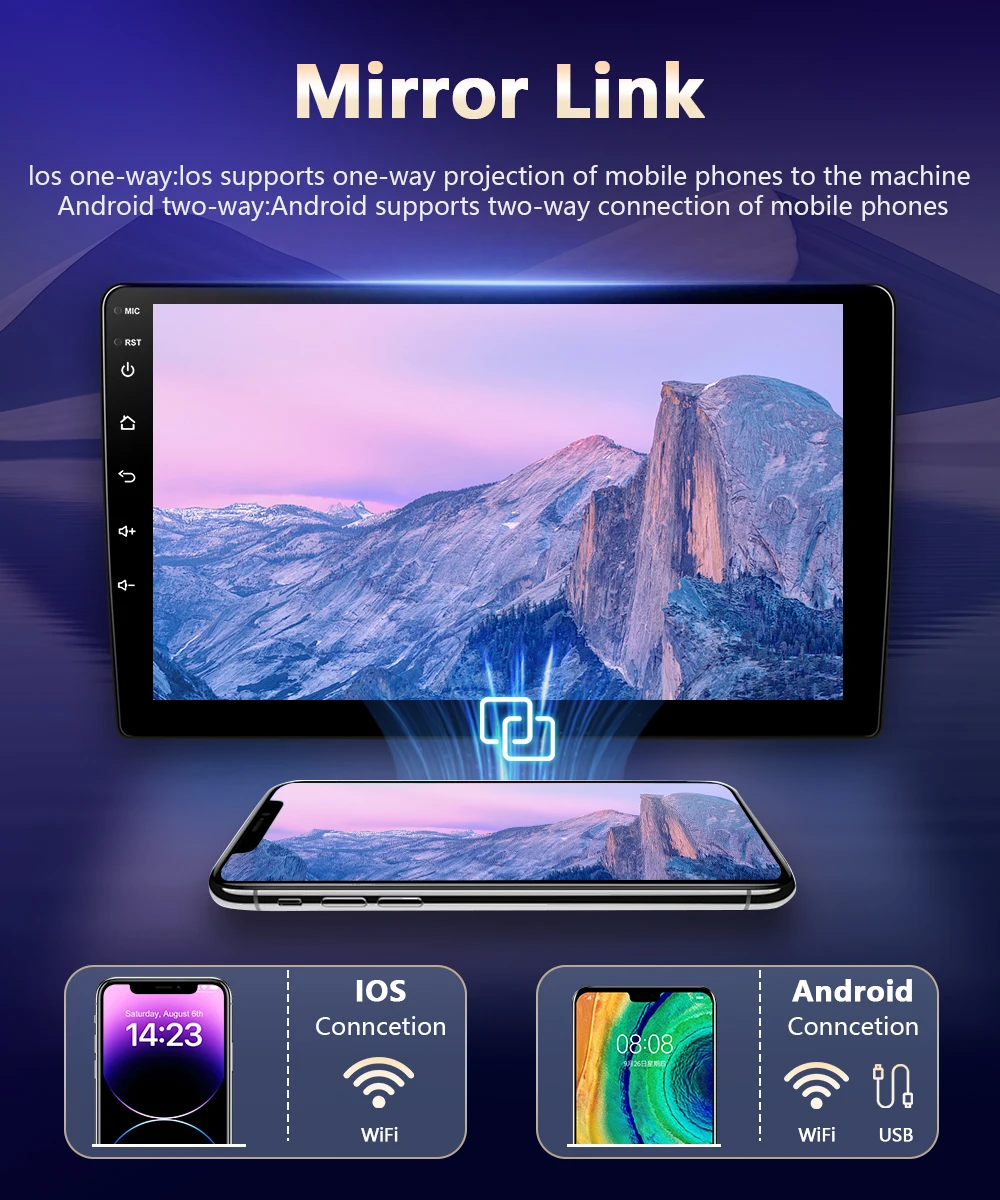 ●Зеркальная ссылка: подключите смартфон к устройству по беспроводной сети и отобразите экран телефона на дисплее устройства.Вы можете использовать приложения на своем телефоне, музыку, видео и многое другое на устройстве.
