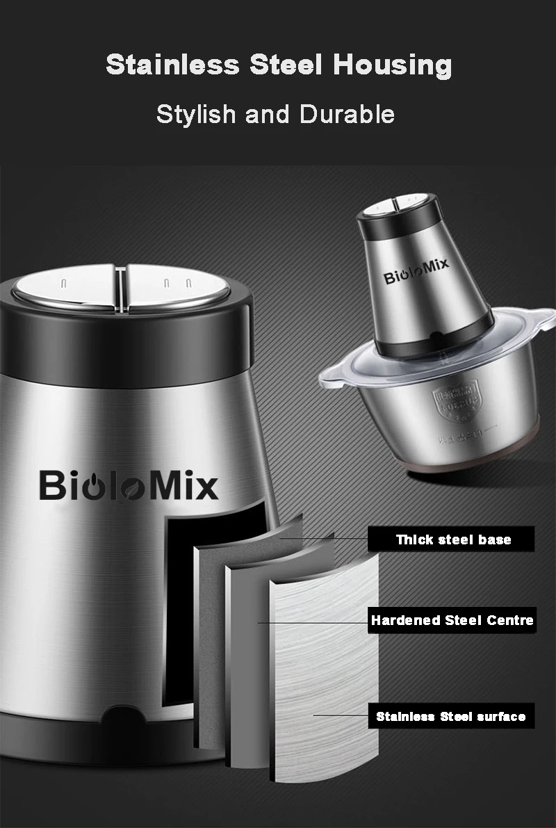 BioloMix 2 скорости, 500 Вт, нержавеющая сталь, емкость 2 л, электрический измельчитель, мясорубка, мясорубка, кухонный комбайн, слайсер