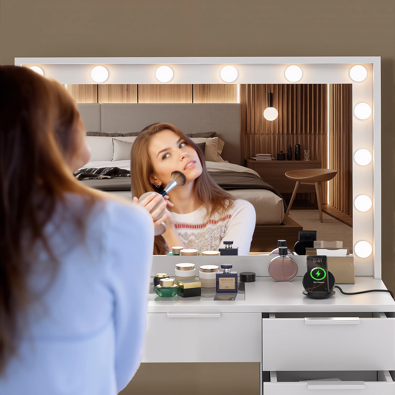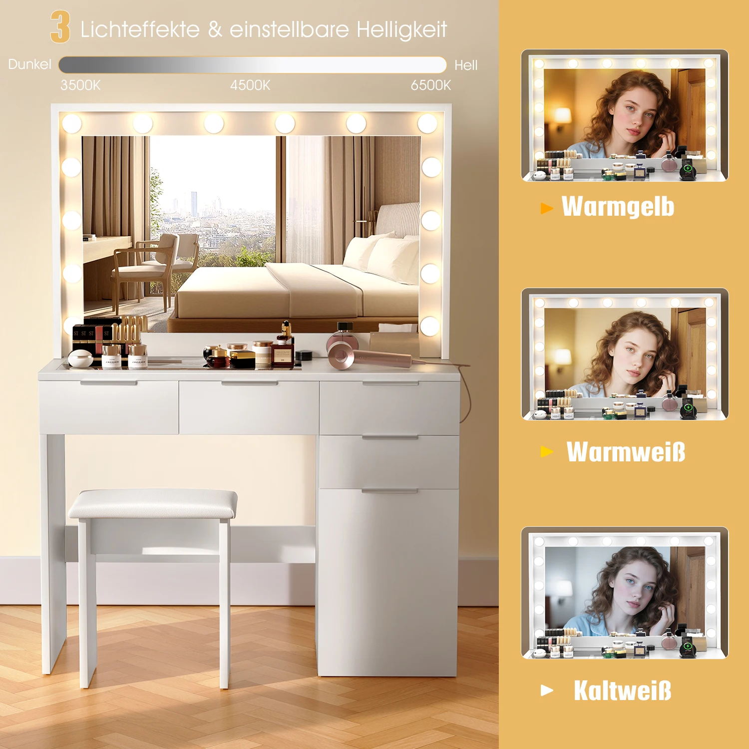 Трехцветное освещение: этот туалетный столик оснащен регулируемым зеркалом со светодиодной подсветкой, которое предлагает три варианта освещения: холодный свет, естественный свет и теплый свет.