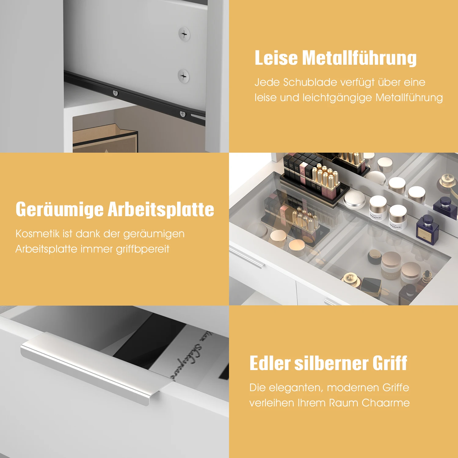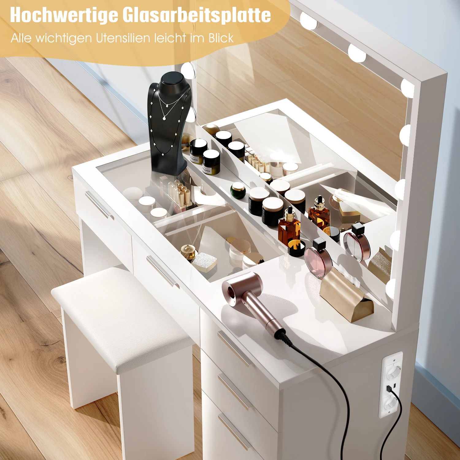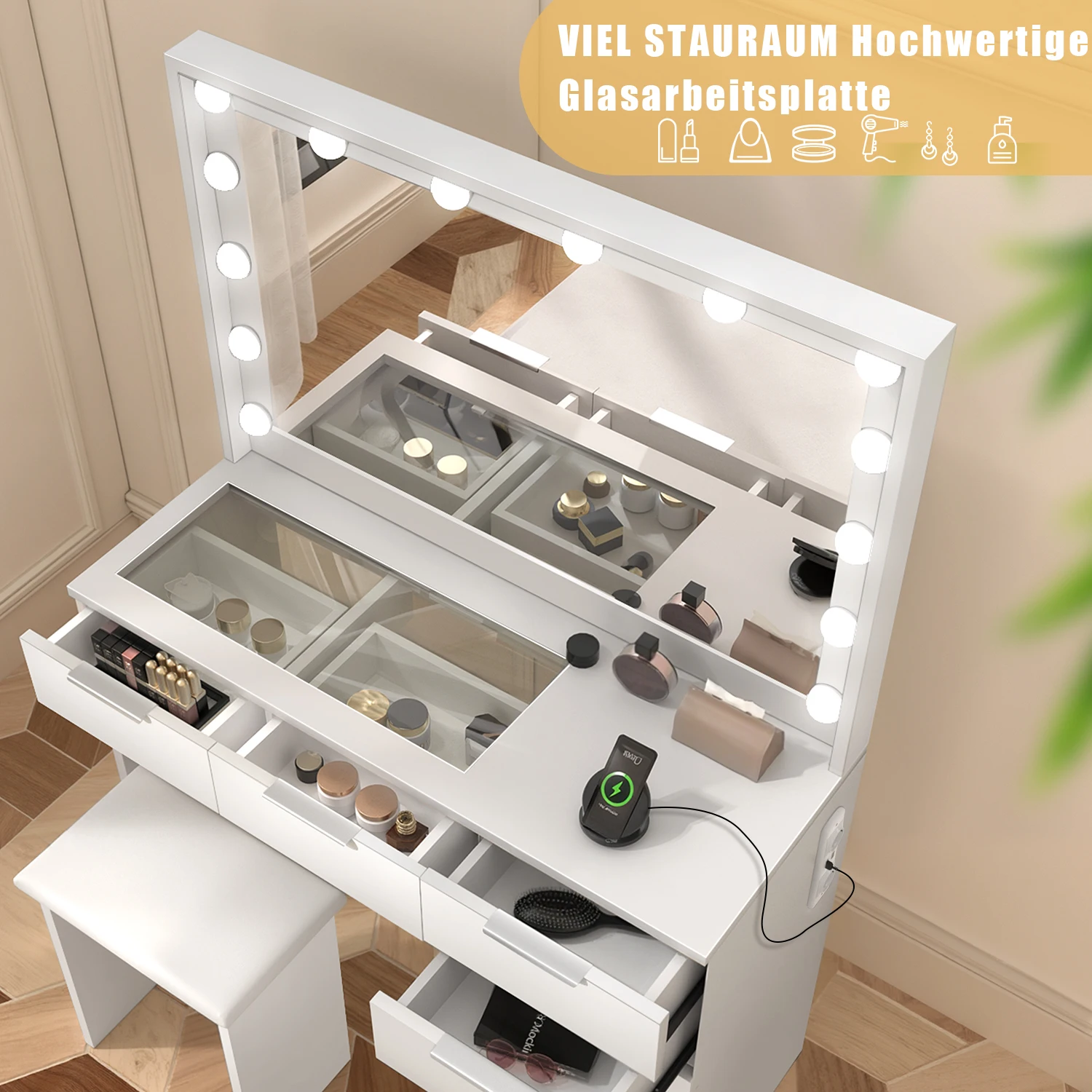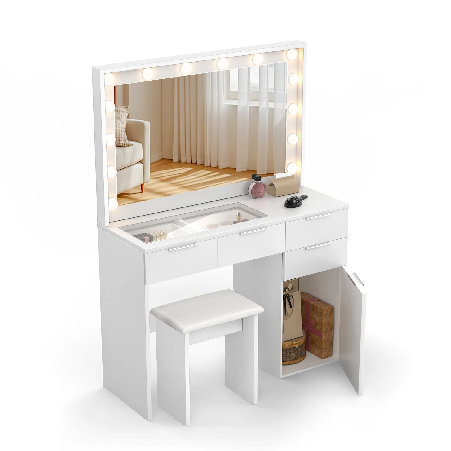 Квадратный туалетный столик с прозрачной стеклянной пластиной: туалетный столик диаметром 105 см с выдвижными ящиками оснащен столиком из прозрачного стекла со светодиодной подсветкой, который можно использовать для хранения различной косметики, парфюмерии, кистей для макияжа, кондиционеров для волос, украшений и т. д.Подходит.
