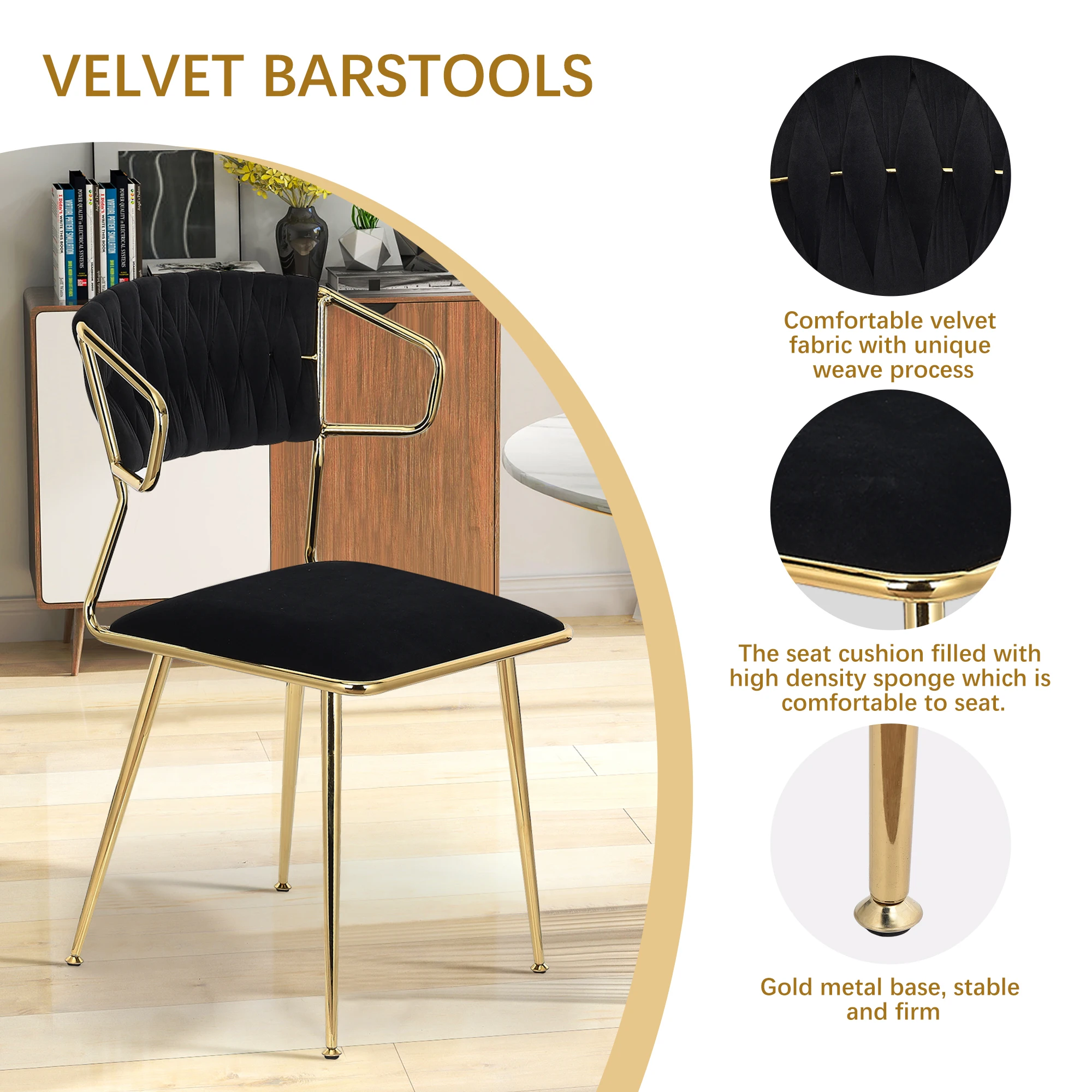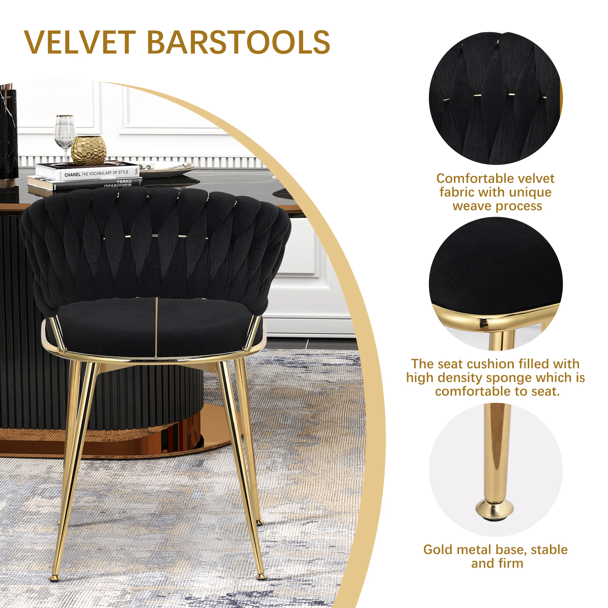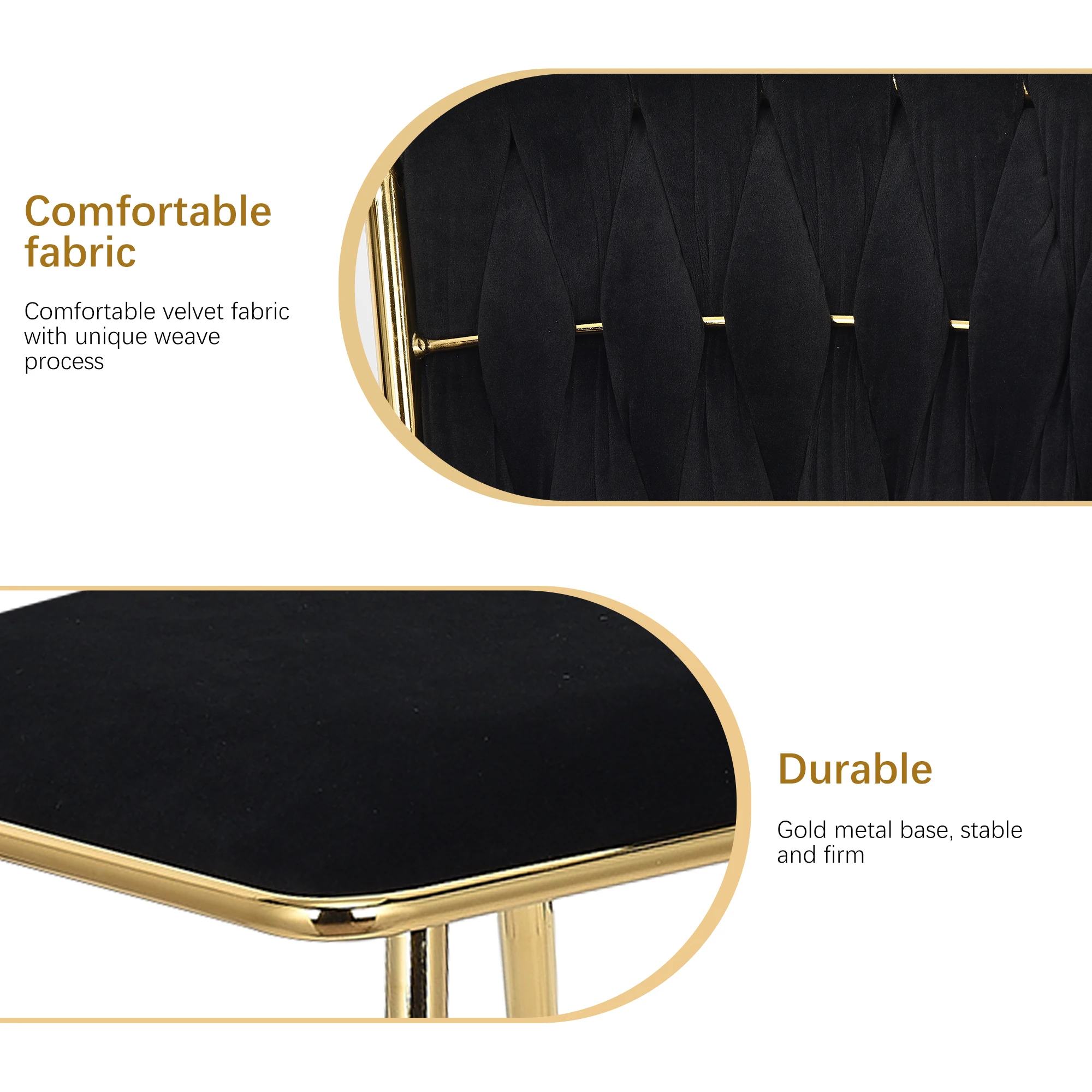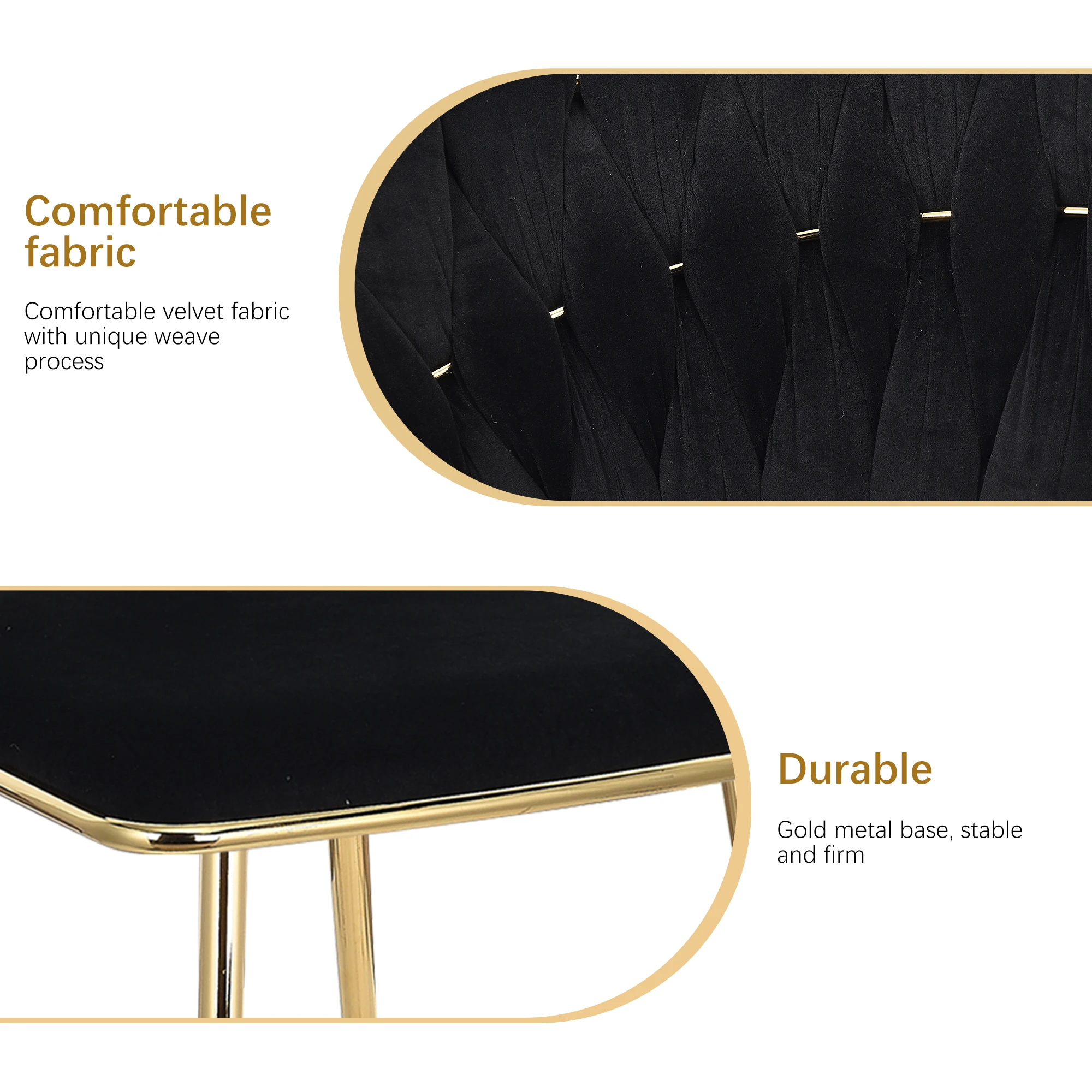 2.Стабильный и прочный: этот бархатный стул, поддерживаемый четырьмя прочными металлическими ножками, обеспечивает превосходную стабильность и долговечность, способную выдерживать нагрузку до 300 фунтов.