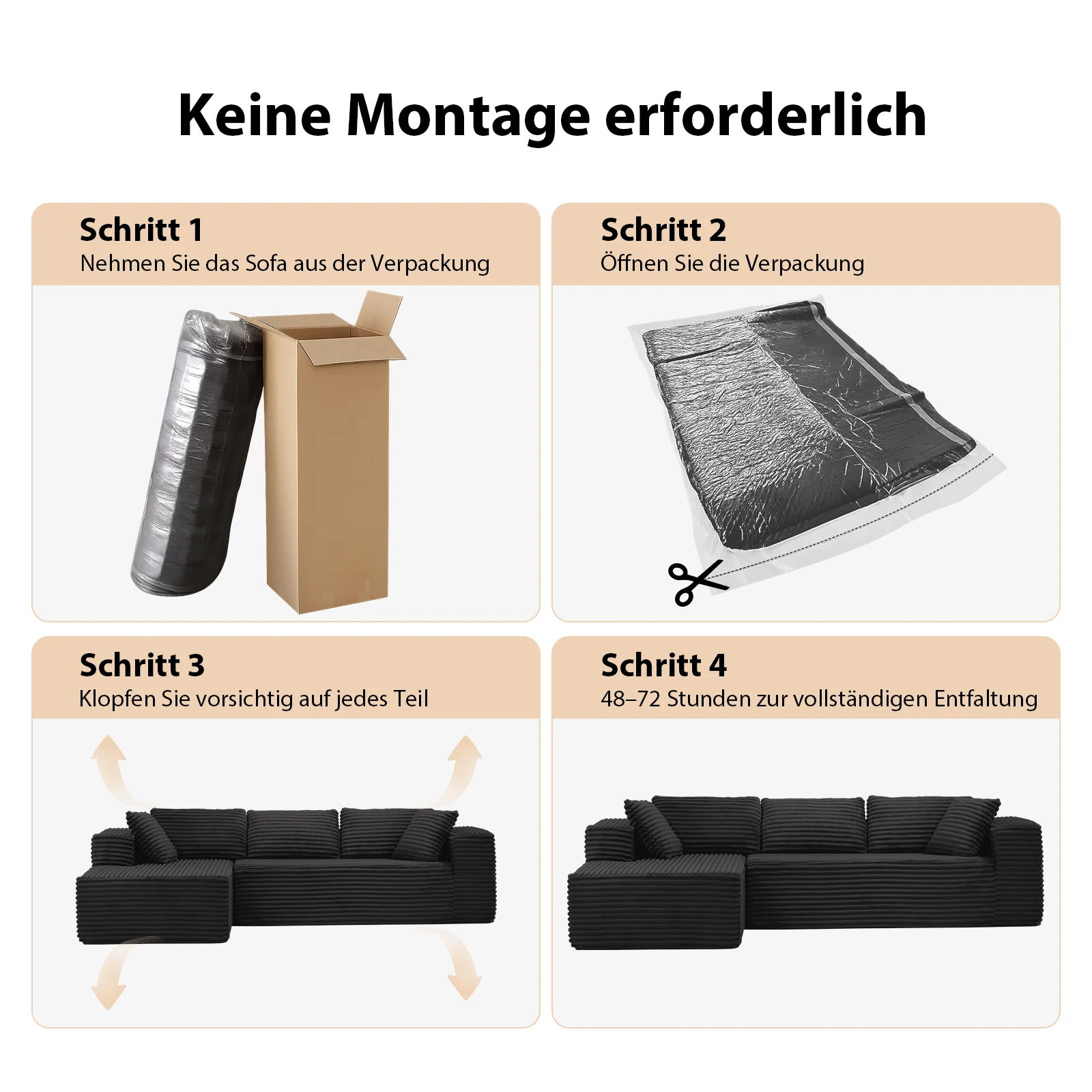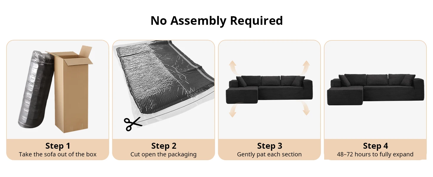 Никакой установки и никаких усилий-Забудьте о инструментах и сложных инструкциях. Этот диван поставляется с вакуумным сжатием — просто распаковывается, слегка постукивает каждую секцию и ожидает 48-72 часов, пока он полностью расширится. Накопление еще никогда не было таким простым.