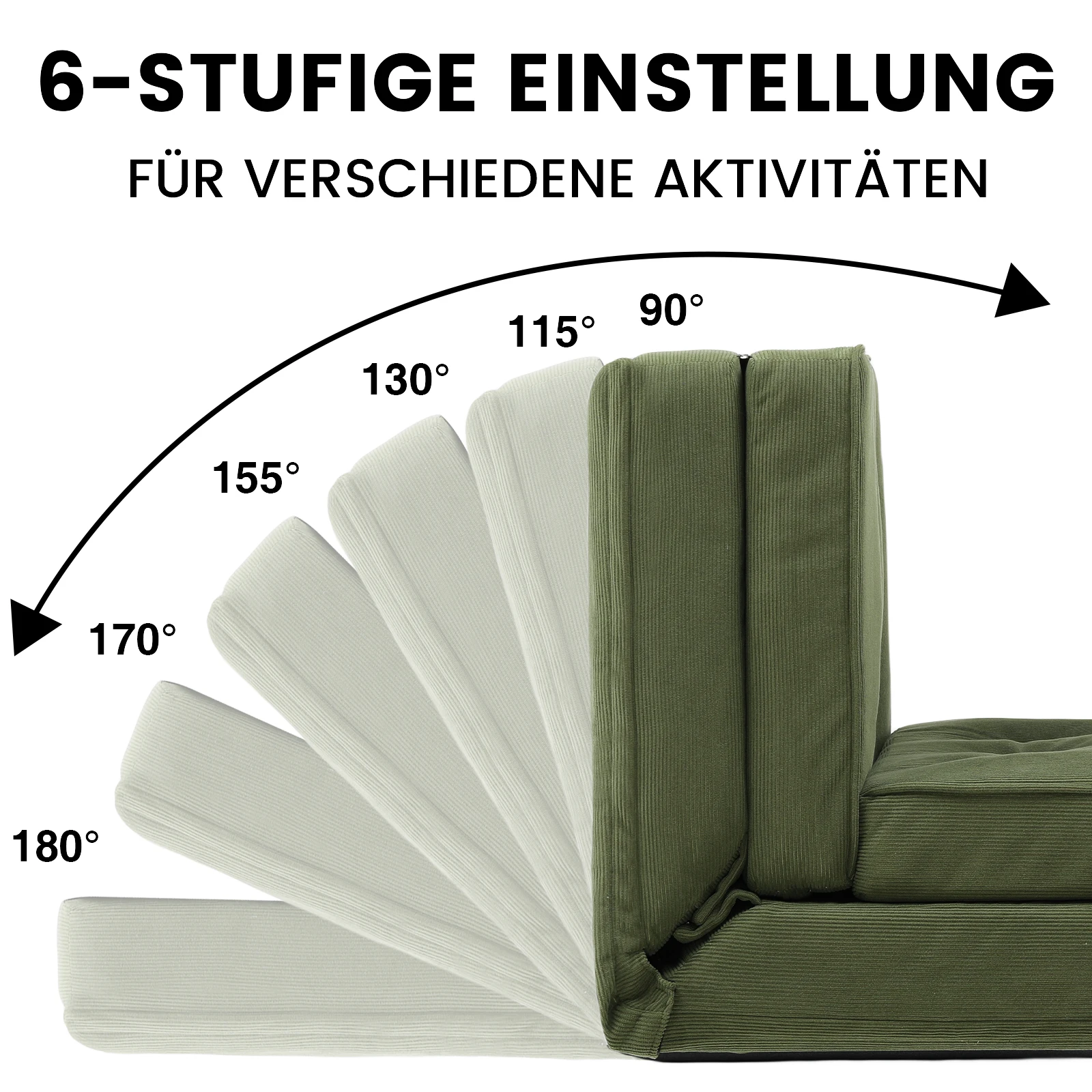 Регулируемая спинка в 6 этапах:Раскладной диван-кровать COMHOMA имеет регулируемую спинку, которую можно закрепить под 6 углами от 90.° до 180°.Складной диван можно легко превратить из дивана в матрас, шезлонг или кресло для отдыха, где вы хотите сидеть, лежать или спать, он подарит вам приятные впечатления.