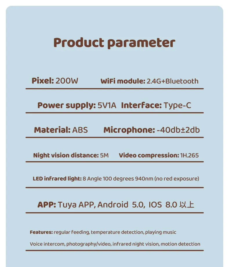 The function of remote camera (can be connected to the internet and mobile app, remotely controlled, photographed, recorded, monitored, and played music) |