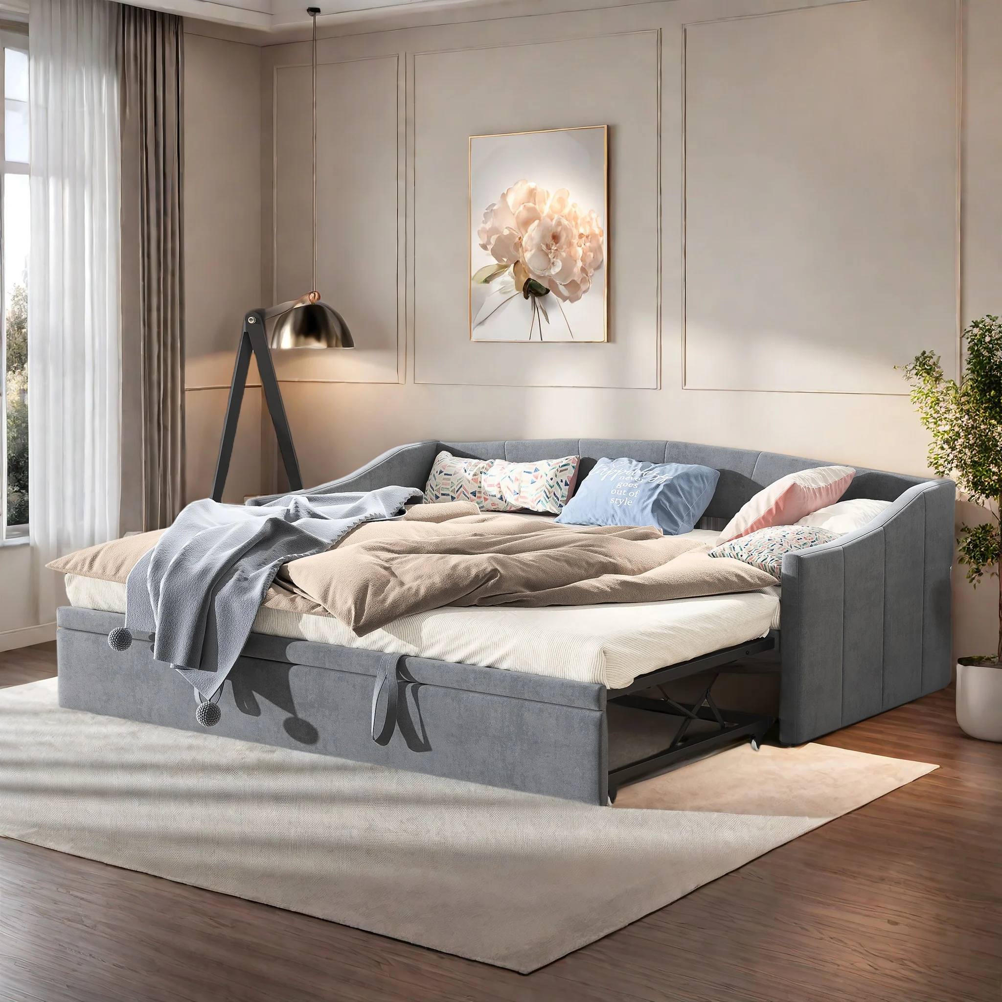 3.[Выдвижная кровать с перекидной спинкой] Выдвижная выдвижная кровать для двух человек оснащена роликами для легкого доступа.