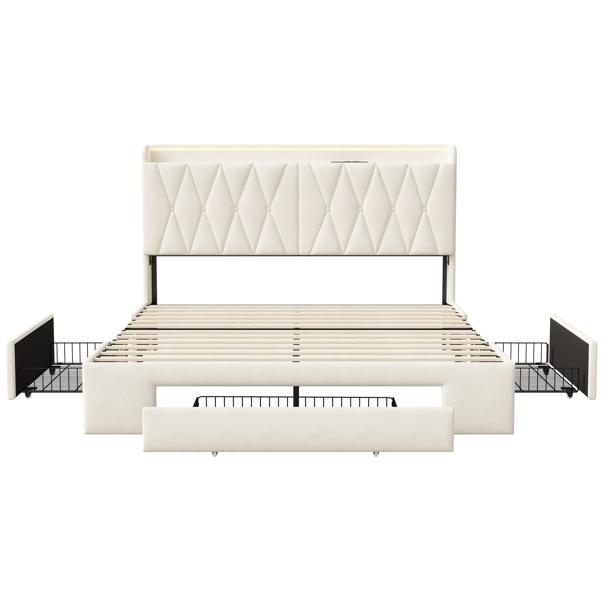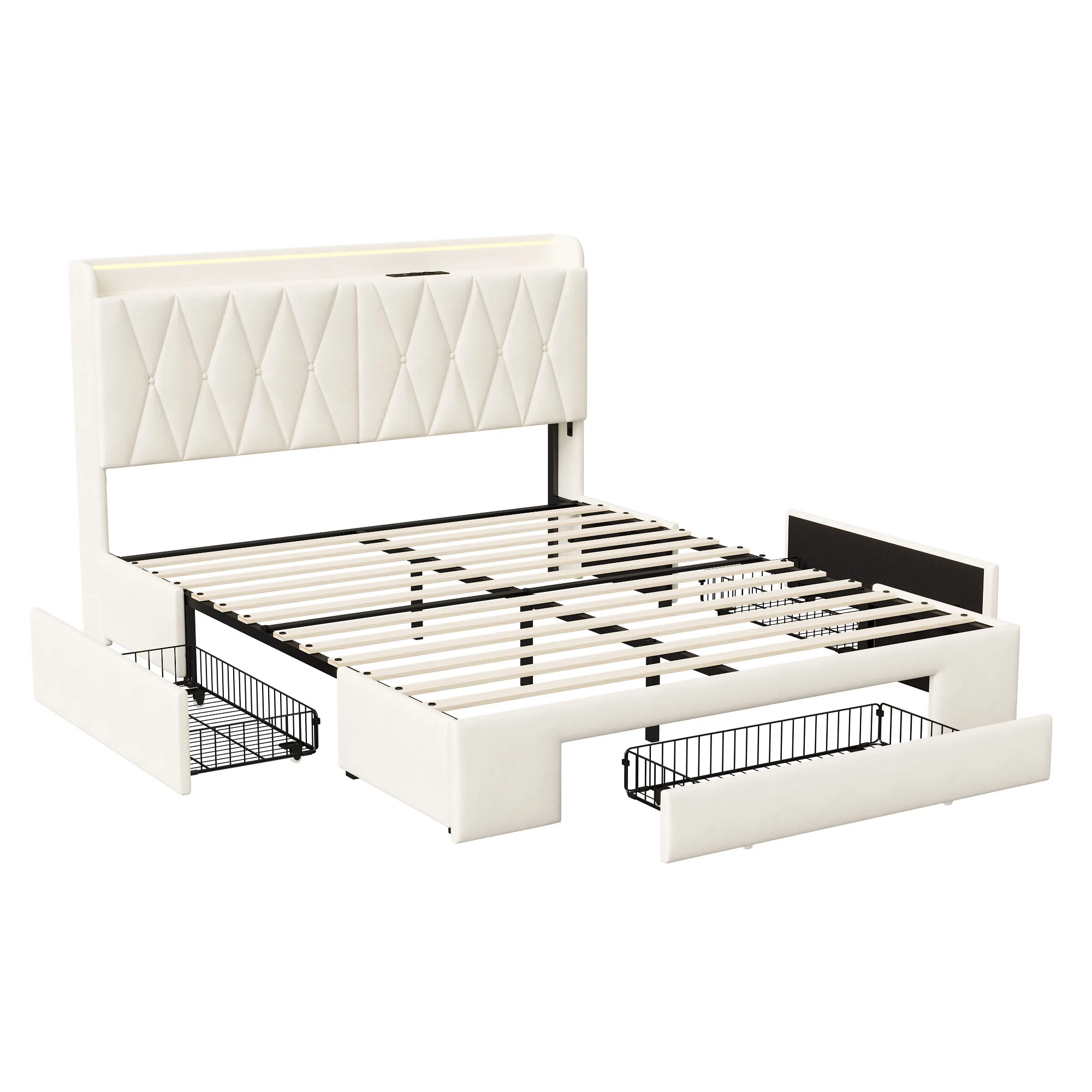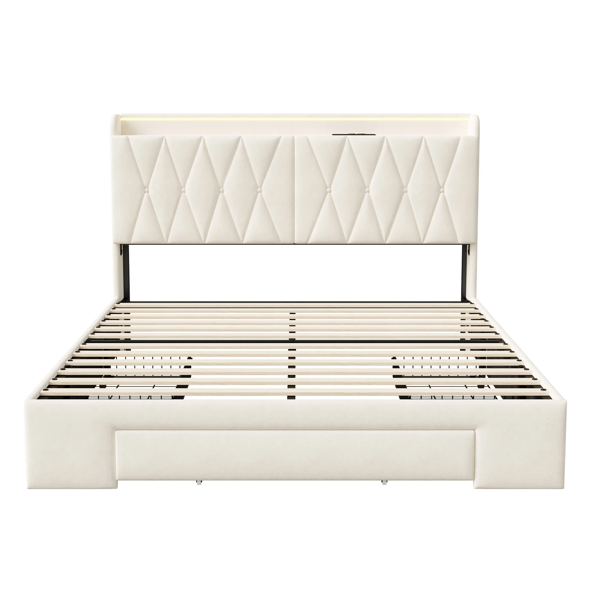 Двуспальная кровать Anajqaqia с мягкой обивкой, кровать для хранения вещей с ящиками, светодиодной подсветкой и зарядкой через USB, бархатная ткань, бежевый