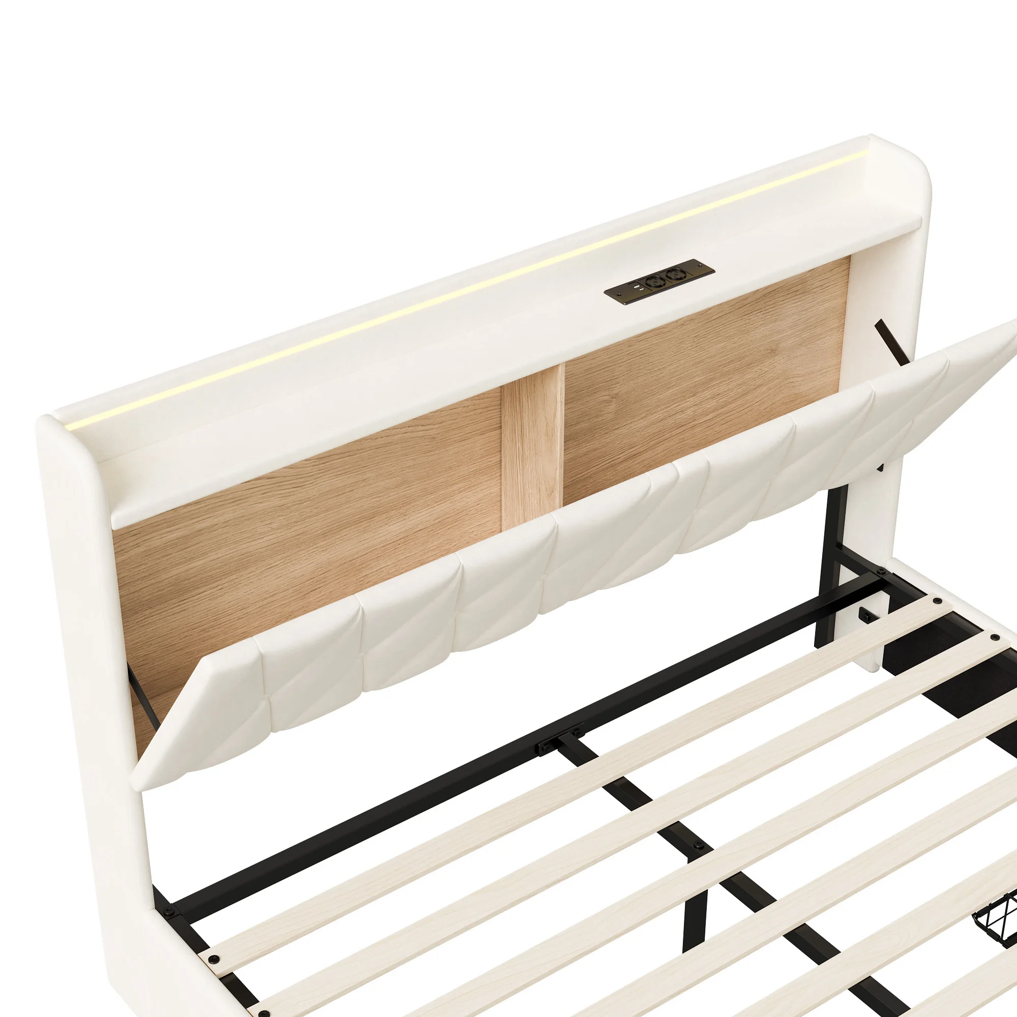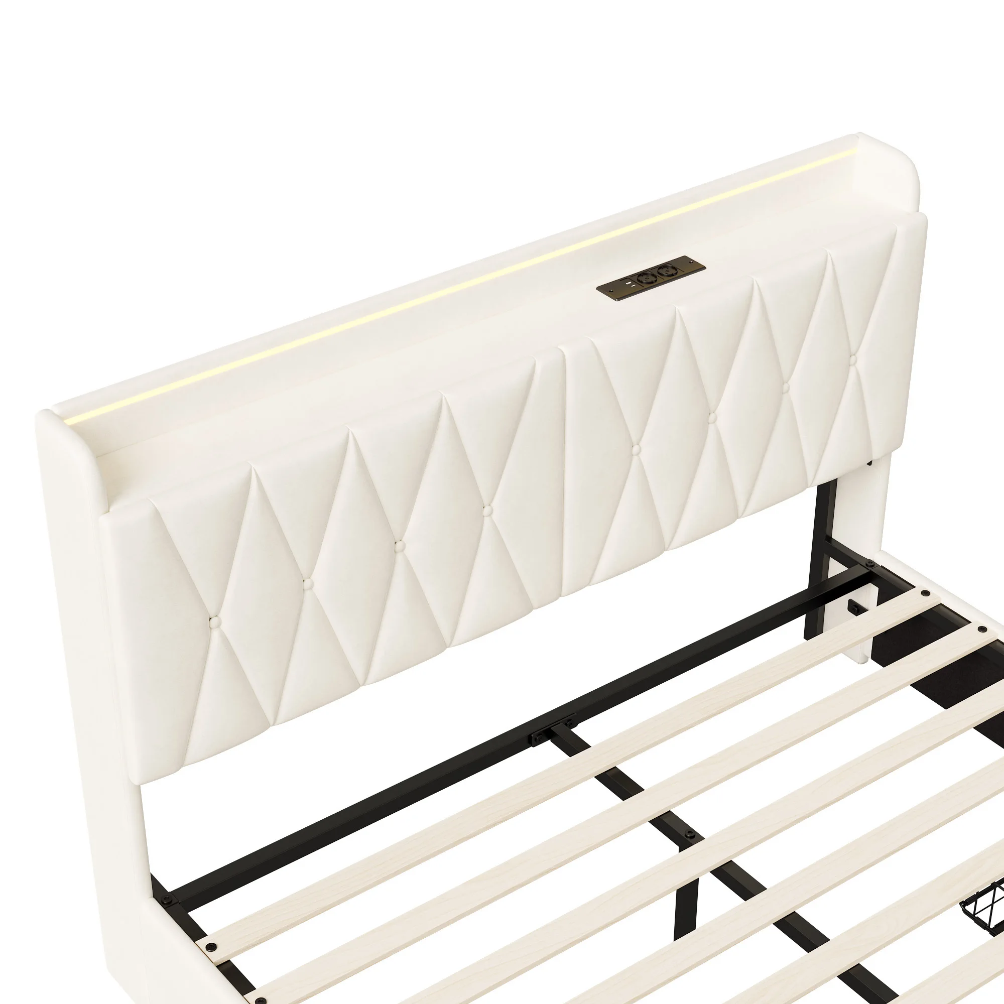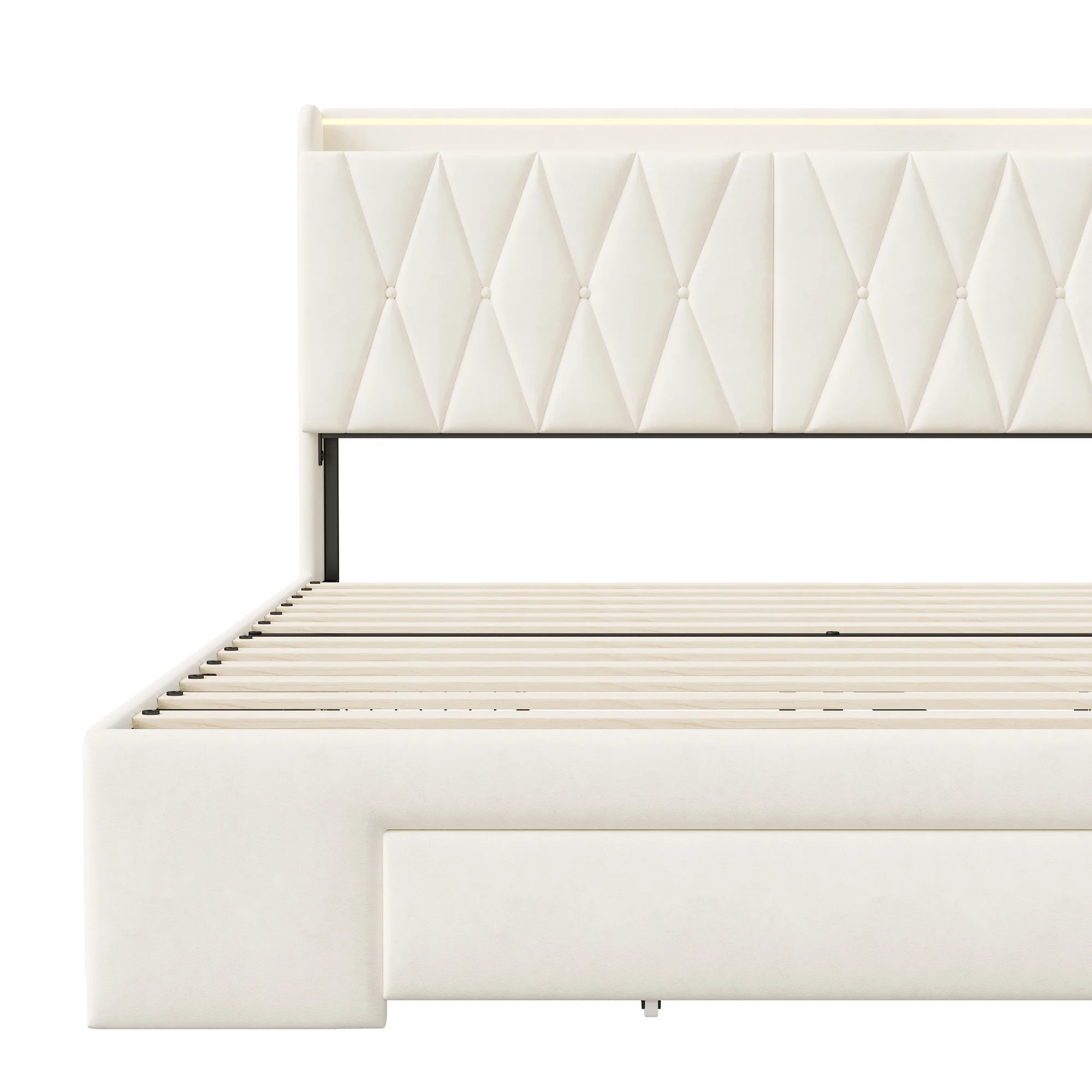 Двуспальная кровать Anajqaqia с мягкой обивкой, кровать для хранения вещей с ящиками, светодиодной подсветкой и зарядкой через USB, бархатная ткань, бежевый